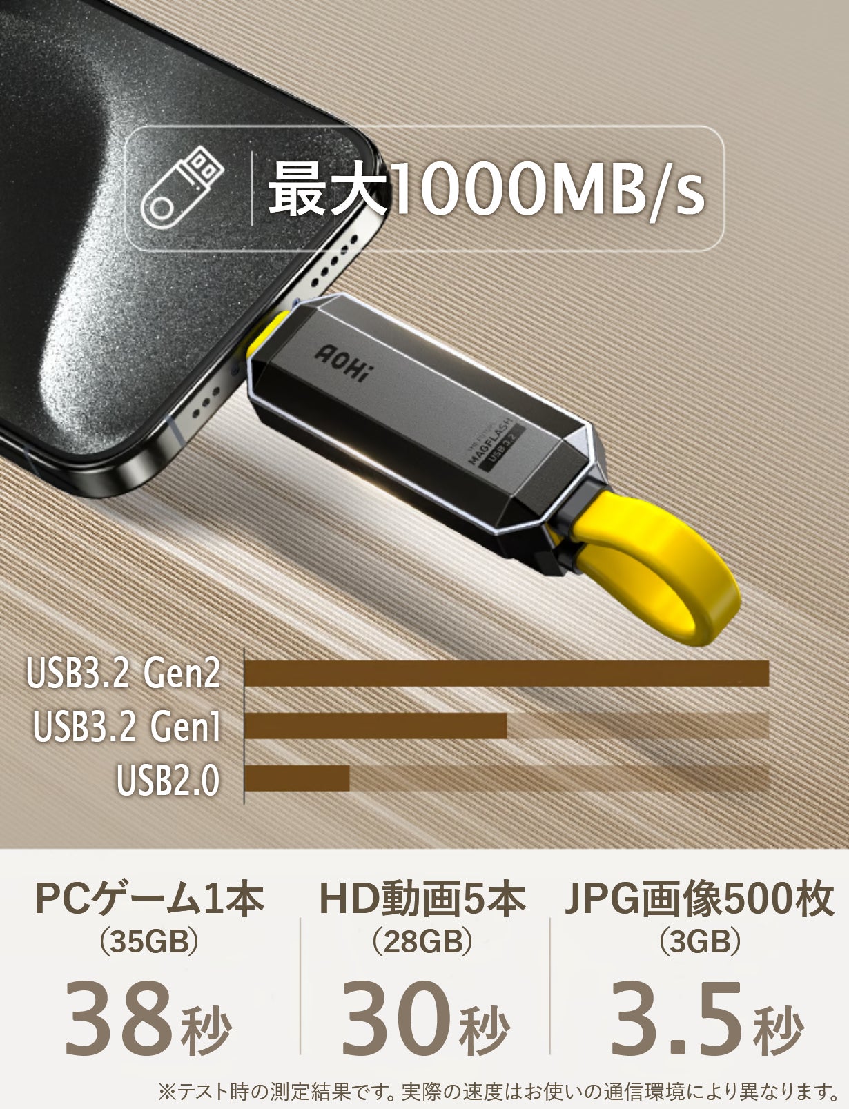 USB 3.2 Gen2の高速転送で、なんと最大1000MB/s!