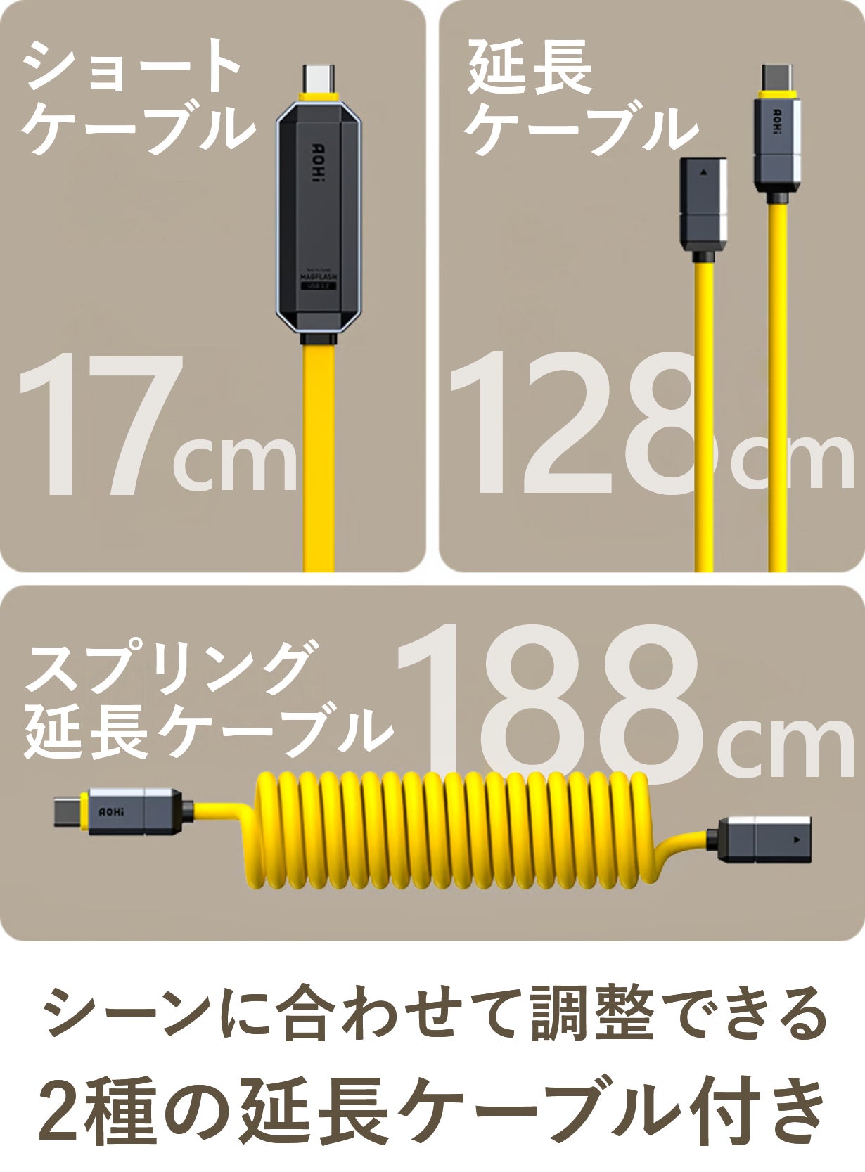 撮影時にはコンパクトなショートケーブル、デスクでは延長ケーブル、ソファでゴロゴロする時はスプリング延長ケーブル…など状況に合わせて選べる延長ケーブルを2種類付属!