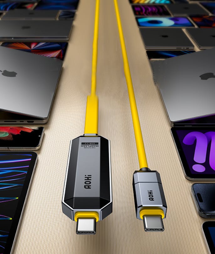 AOHi MagFlashは、異なるシチュエーションに対応できる2種類のケーブルを提供しています。撮影時にはコンパクトな17cmのショートケーブルを使用し、デスクワークには128cmの延長ケーブルが理想的です。さらに、188cmのスプリング延長ケーブルは、ソファでリラックスしながらデバイスを快適に接続できるよう設計されています。これにより、どんな状況でも最適なケーブルを選んで使うことができます。