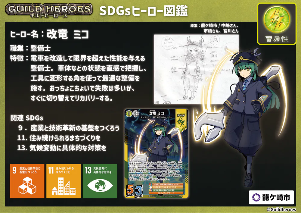 2025/02/06 22:02プロジェクトも折り返し地点に到着しました!残り22日!これまでご支援いただきました皆さま、ありがとうございます。ただ、目標額に対してはまだ4分の1ほどです。ご支援いただきました皆さまにも、ぜひ、周りの方やご友人などにもお声かけいただいたり、SNSなどを通じて周知拡散にご協力いただけますと幸いです。ちなみに、この高校生たちが龍ケ崎市にある職業(ギルド)を調査して、キャラクター化する取組は、今年度が2年目。今年度は、モチーフは「関東鉄道」「竜ヶ崎線」についてになっていますが、取組の最初の年となった昨年度は、モチーフは「龍ケ崎コロッケ」さんと「株式会社諸岡」さんでした。ちょっとだけ、昨年度のキャラもご紹介します!(一部今回のリターンにもトレーディングカードが付いてくるものもあります!チェックしてみてください。)龍ケ崎コロッケを扱う店舗の皆さまで構成している「コロッケクラブ龍ケ崎」さんをモチーフにしたのが、女の子の方の「リコ」リコは、一昨年のイベント「コロッケ横丁」でリアルリコちゃんも登場し、同団体のイメージキャラクターになっています。また、株式会社諸岡さんをモチーフにしたのが、男の子の方の「レイン」レインは、重機製造・販売の諸岡さんが取り組む、緑化保全活動の内容をレインの持つ特技に生かし、水を生み出せる能力やどこでも走れる重機の特性をキャタピラー型の靴を履くといった、企業の持つ特徴を反映したキャラになっています。今回のキャラクター「リュウニコーン・サキ」と「改竜ミコ」と合わせてごひいきにしてくださいませ。 もっと見る