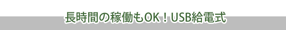 USBでの給電式を採用。いつもお使いのモバイルバッテリーやACアダプターに接続することで長時間の稼働も可能です。
