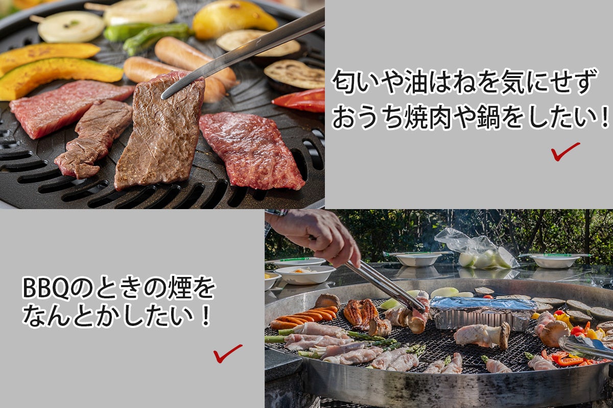 屋外でのバーベキューや調理中にありがちな、煙や油が目に入ることもDesktop range hoodなら一気に解消できます!
