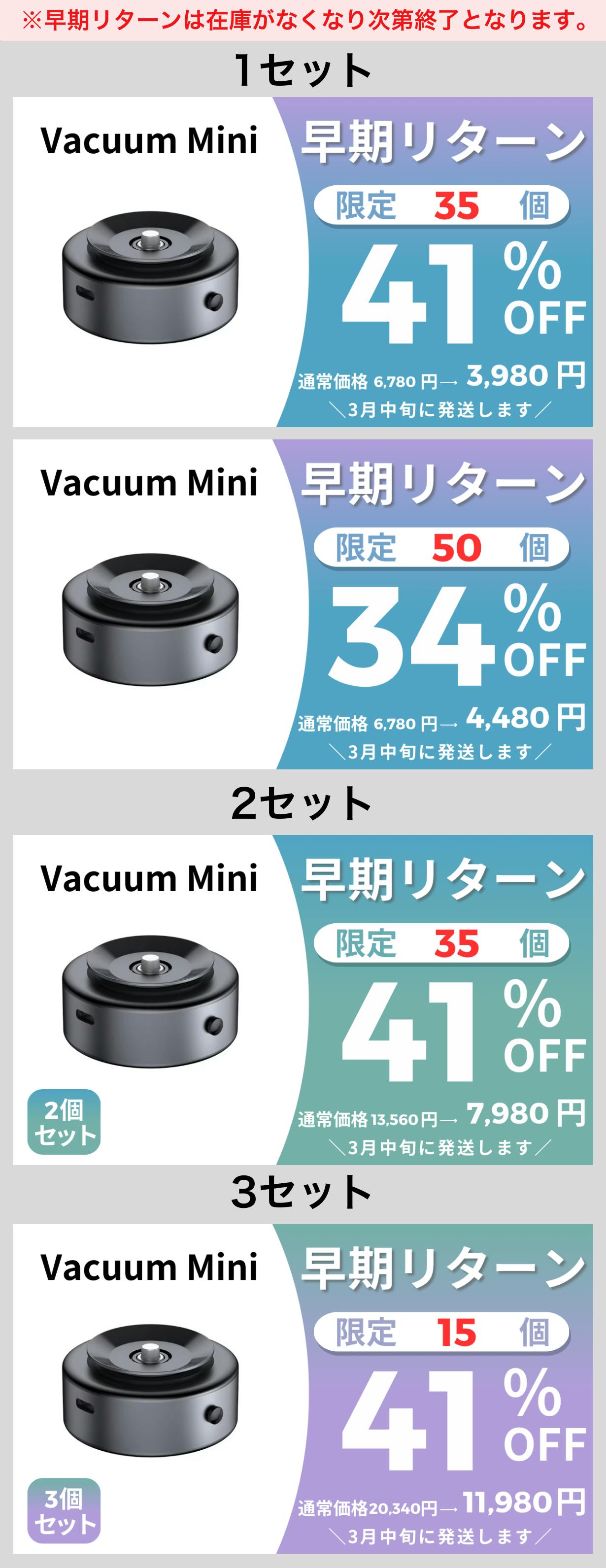 大好評をいただき大成功したVacuumシリーズの新作登場を記念して、CAMPFIREだけの購入者限定プレゼントキャンペーンを実施します!ご支援者様の中から抽選で当たった方に、なんとVacuum Miniをもう1つプレゼント!!