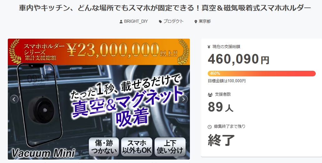 ご支援者様、車内やキッチン、どんな場所でもスマホが固定できる!真空&磁気吸着式スマホホルダーにご興味をお持ちいただきありがとうございます。プロジェクト開始から39日目で89人ものご支援者の方々より支援頂き、無事プロジェクト終了を迎えることが出来ました。早速皆様のリターンを2025年06月末にお届けできるよう準備を始めております!皆様にご満足いただけるリターンをお届けできるよう、全力で取り組んで参りますので引き続き、「車内やキッチン、どんな場所でもスマホが固定できる!真空&磁気吸着式スマホホルダー」をよろしくお願い致します。BRIGHTチーム
