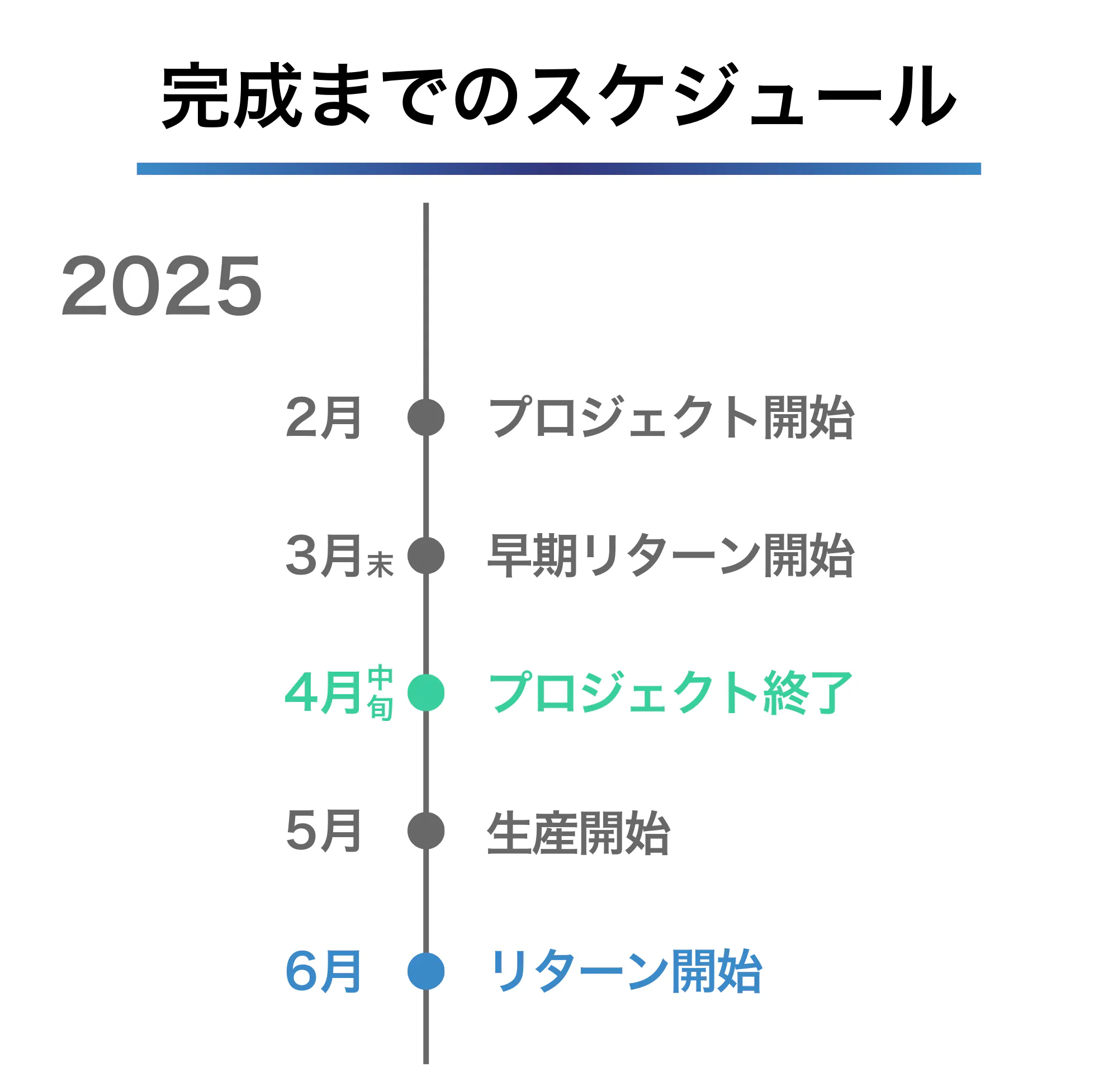 ※本文中に記載させていただいたスケジュールは、あくまでプロジェクト公開時点の予定です。クラウドファンディングを経て輸入を行う性質上、配送遅延のおそれがございます。