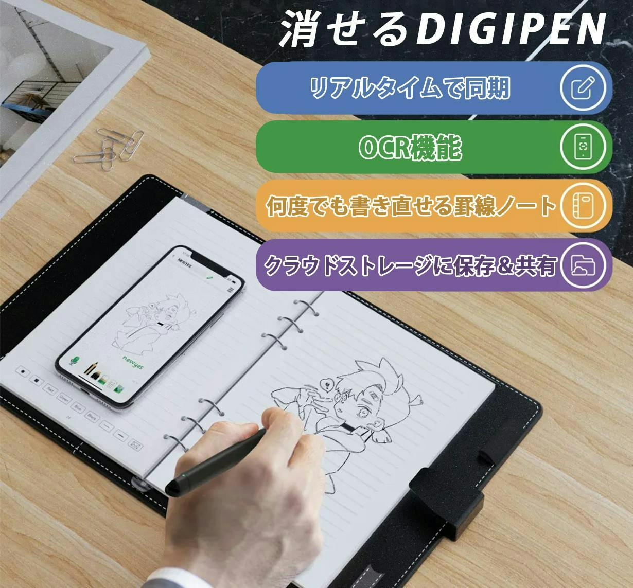 DIGIPEN(デジペン)には手書きした内容を撮影するカメラが搭載されており、A5サイズの付属リングノートにDIGIPENで書いた内容を、専用アプリとBluetooth連携するだけでリアルタイムで電子テキスト化出来ます!