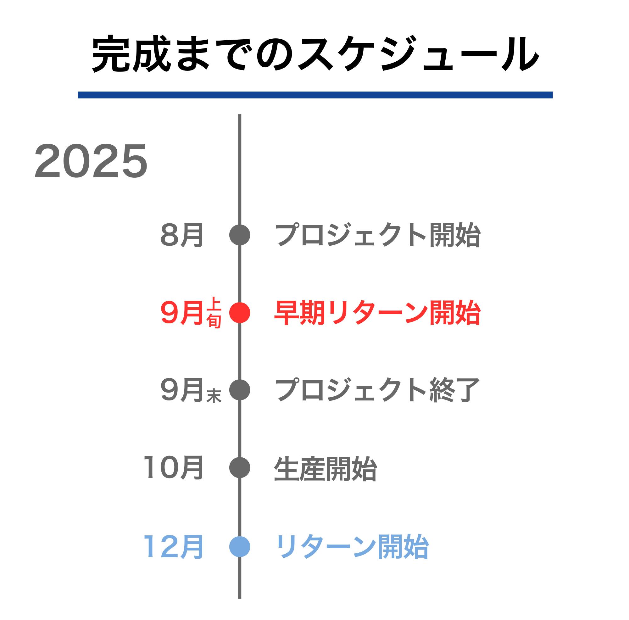 ※本文中に記載させていただいたスケジュールは、あくまでプロジェクト公開時点の予定です。クラウドファンディングを経て輸入を行う性質上、配送遅延のおそれがございます。