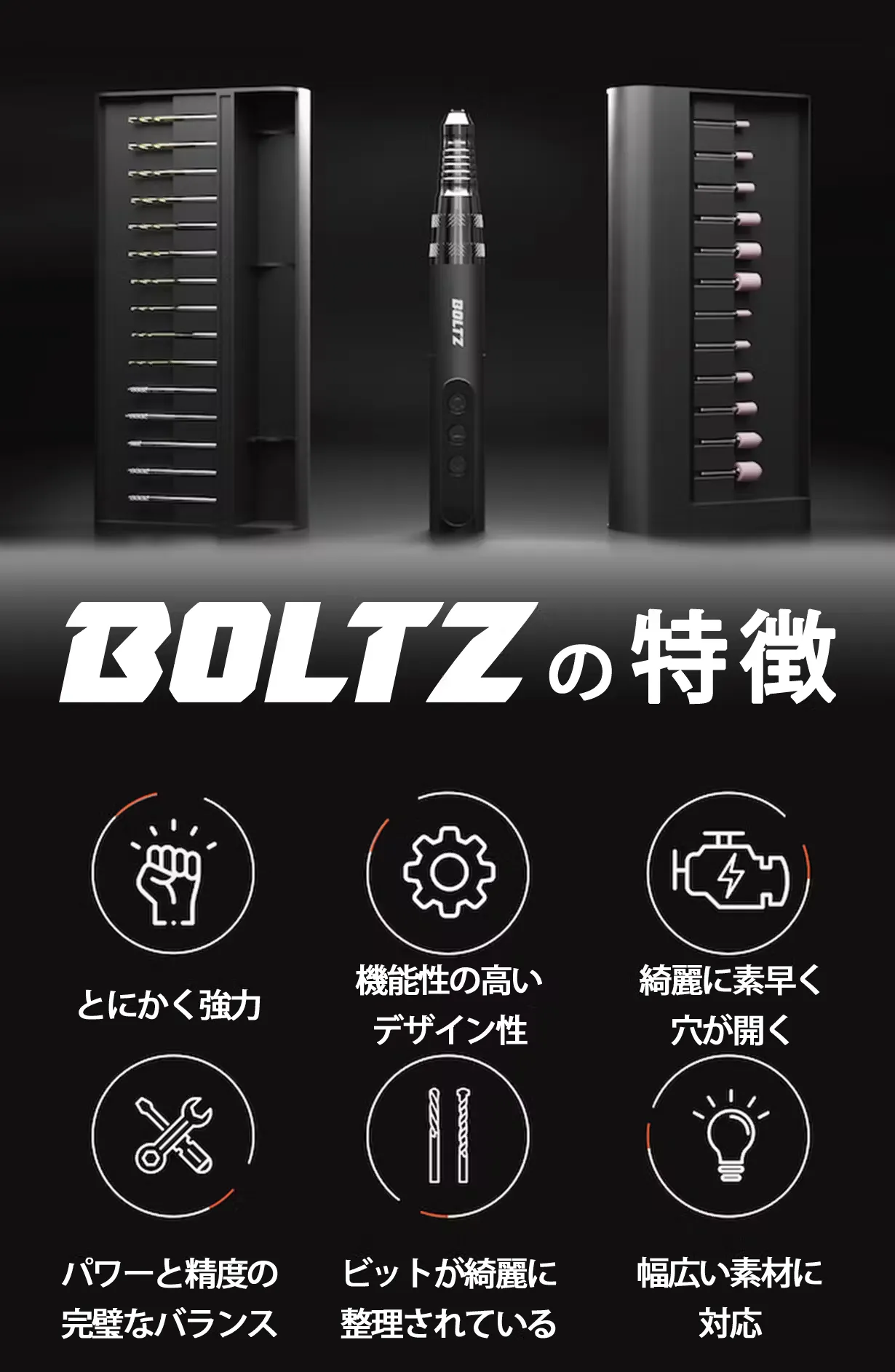 BOLTZがあれば「切る」「ドリルする」「彫る」「研磨する」がより簡単かつ快適なものになるでしょう!