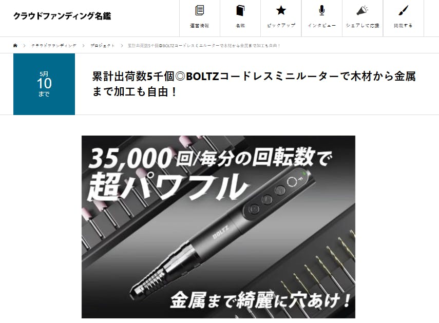 皆様、こんばんは!Brightチームです。先日、クラウドファンディング名鑑で「BOLTZ + Bench Top 第4弾」を紹介して頂きました。話題:累計出荷数5千個◎BOLTZコードレスミニルーターで木材から金属まで加工も自由!興味がある方、是非下記のリンクからアクセスしてみてください。https://crowdfunding.meikan.org/project/campfire-814601/【レビューの一部抜粋】〈次世代DIYツール「BOLTZ」新たなDIYの時代を切り開く「BOLTZ」は、プロフェッショナルなデザインと高性能を兼ね備えたコードレスミニルーターです。7000から35000回転まで対応し、さまざまな素材に対応可能なこのツールは、DIY愛好者からプロフェッショナルまで幅広く利用されています。特に、ツインベアリング技術により、精度の高い作業が実現できる点が大きな魅力です。多機能で使いやすい設計BOLTZは、使いやすさを追求したスタイリッシュなデザインが特徴です。スイッチやボタンの配置が工夫されており、異なるモード間の切り替えもスムーズです。また、LEDディスプレイにより設定が可視化され、作業の効率が向上します。さらに、軽量設計で疲れにくく、充電もType-Cで約40分で完了します。支援のお願いこのプロジェクトは、皆さまの支援によって実現します。集まった資金は、商品仕入れやプロモーション費用に活用され、より多くの方にBOLTZを知っていただくための重要な役割を果たします。ぜひ、あなたの力で次世代のDIYツールを支えてください。詳しくはプロジェクトページをご覧ください。〉ご興味のある方はこの機会をお見逃しなく!https://camp-fire.jp/projects/814601/view4月30日まで販売期間は続きますので、ぜひSNSでのシェアや身近な方にもおすすめしていただけると嬉しく思います。#brightdiyどうぞよろしくお願い致します。BRIGHTチーム