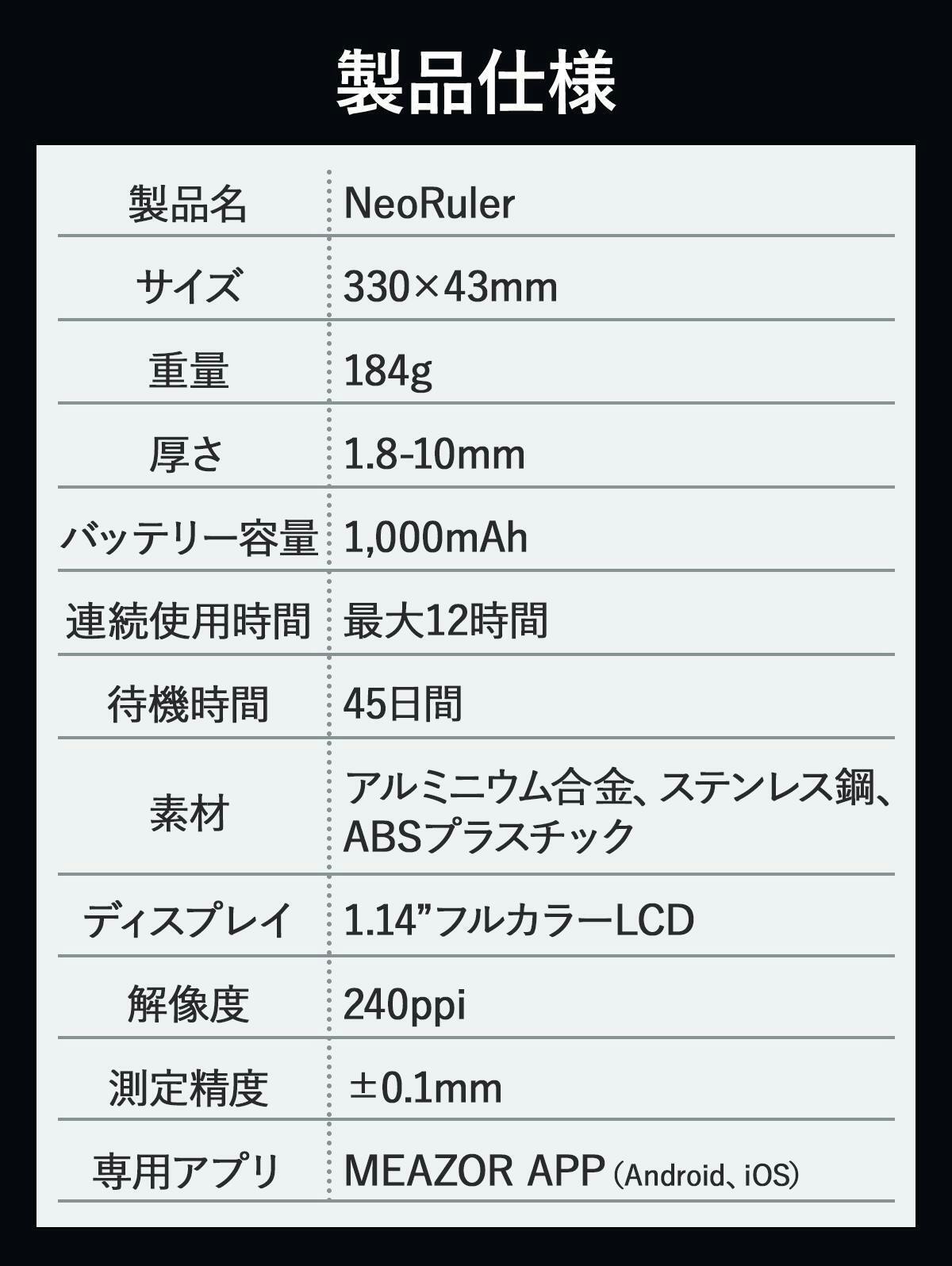 NeoRulerは耐久性のある高品質のアルミニウム製ユニボディフレームを採用しています。さらに電子部品は 18,000 回以上の連続動作寿命テストに合格しており、プロフェッショナルな作業にも適しています。
