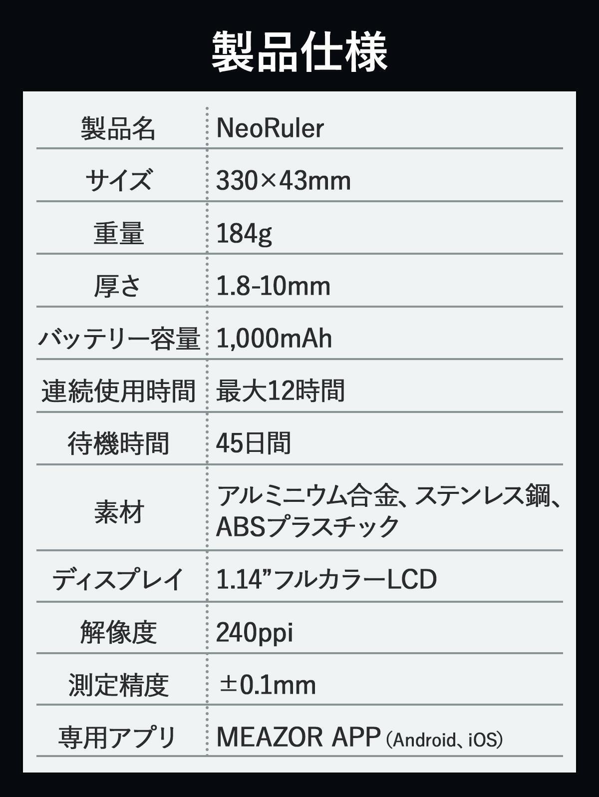 お客様に信頼していただける高品質で高寿命な製品をお届けするために、NeoRulerは部品ひとつひとつに拘り、最適な素材を繰り返し検討、慎重に選択し製造しています。