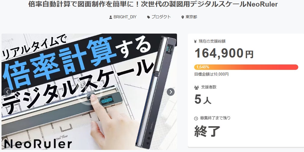 • ご支援者様、倍率自動計算で図面制作を簡単に!次世代の製図用デジタルスケールNeoRulerにご興味をお持ちいただきありがとうございます。プロジェクト開始から40日目で5人ものご支援者の方々より支援頂き、無事プロジェクト終了を迎えることが出来ました。早速皆様のリターンを2025年06月末にお届けできるよう準備を始めております!皆様にご満足いただけるリターンをお届けできるよう、全力で取り組んで参りますので引き続き、「倍率自動計算で図面制作を簡単に!次世代の製図用デジタルスケールNeoRuler」をよろしくお願い致します。BRIGHTチーム もっと見る