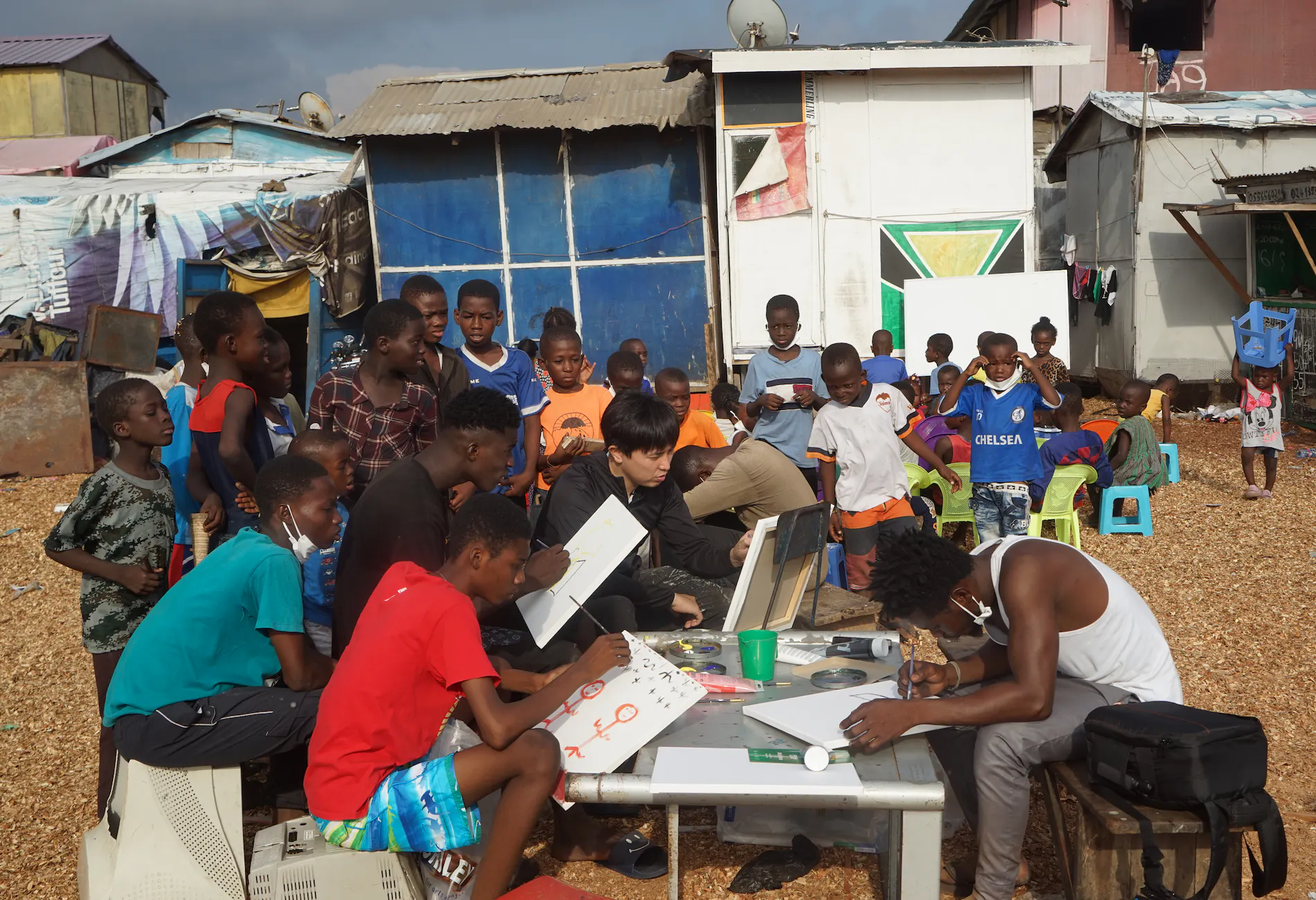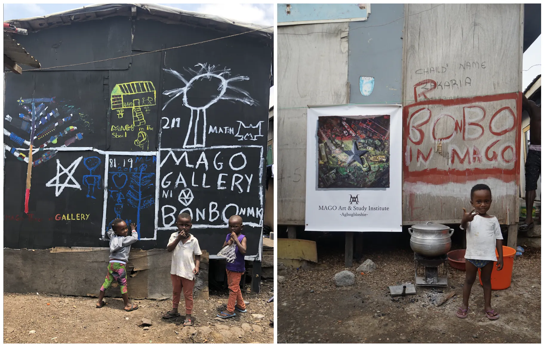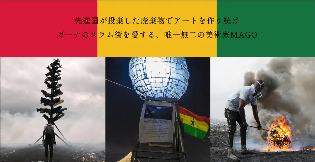 2019年、ガーナのスラム街”アグボグブロシー”に始めての文化施設「MAGO E-WASTE MUSEUM」を建設した際、長坂の代表的な作品である「Moon Tower」や「E-Waste Tree」の制作を毎日一生懸命手伝ってくれた現地の青少年達。これまで文化というものが全く存在していなかったスラムに住む彼らにとって、長坂との作品制作は、初めてアートに触れ興味が湧いた瞬間でした。