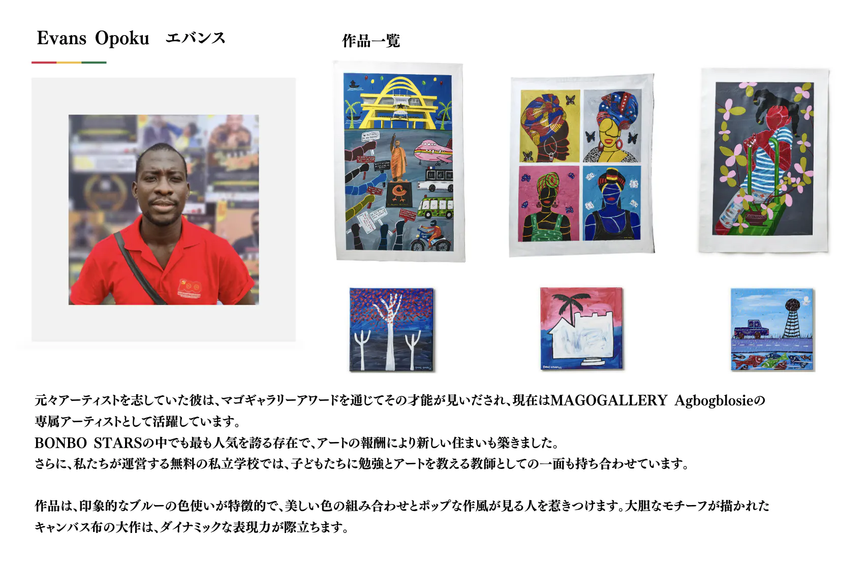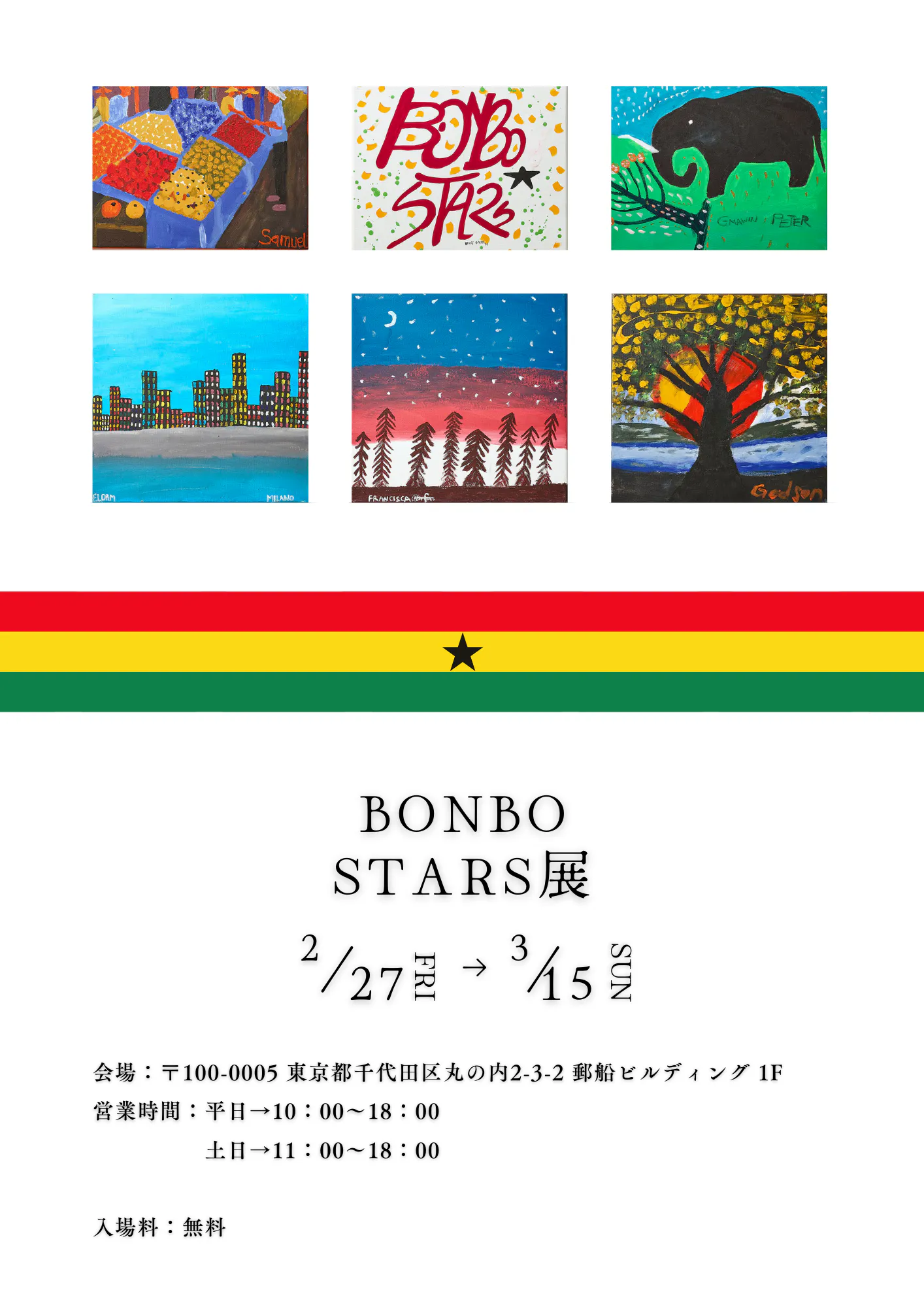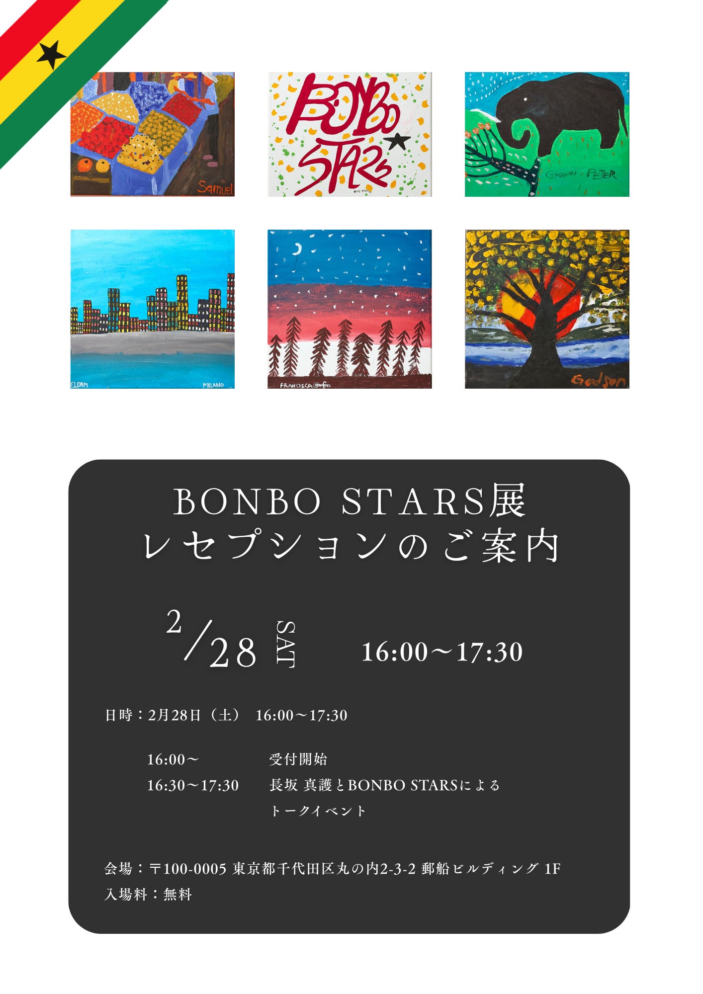 2026/02/22 15:46クラウドファンディングで応援してくださった皆さまへ展示会情報をお知らせ申し上げます。この度、スラム街から生まれたアーティストたち「BONBO STARS」の展示会を開催する運びとなりました。【BONBO STARS展のご案内】アフリカ・ガーナのスラム街から生まれ、長坂真護がプロデュースしているアーティストたち「BONBO STARS」の2度目の単独個展が開催されます!作品の売り上げの10%が作家本人に給料として還元されています。彼らの多くはそのお金を学費に充てたり、家族のために家を建てるなど、それまでは叶えられなかった夢を叶えたり、自分たちの未来を切り拓くために使われています。★★★■ 展覧会情報BONBO STARS展会期:2026年2月27日-3月15日 平日 10:00-18:00/ 土日 11:00-18:00会場: 郵船ビルディング内 〒100-0005 東京都千代田区丸の内2-3-2 郵船ビルディング 1F入場料:無料★★★厳しい環境の中でアートと出会い、人生を動かしていった彼らが描く希望、そしてアートへの想いを体感してみてはいかがでしょうか。ぜひこの機会に足をお運びくださいませ。皆様のご来場を心よりお待ち申し上げます。 もっと見る