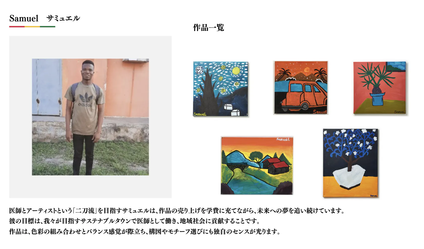 スラム街から成り上がる手段はサッカー選手になるしかない。と知った時にこのプロジェクトの構想が浮かびました。スラム街でアーティストになりたい人々に絵を教え、彼らの作品を先進国で販売し、その売り上げの10%を作家本人に支払う仕組みです。