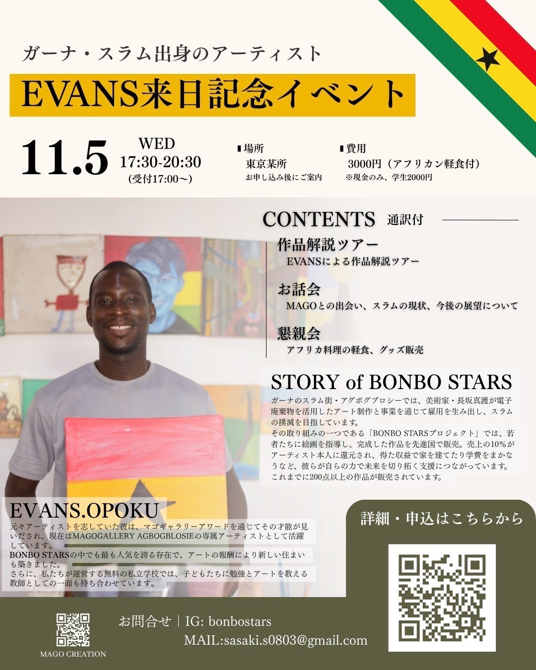 2025/10/29 16:18ガーナのスラム街・アグボグブロシー出身で、BONBO STARS のメンバー EVANS が急遽、来日することになりました!弊社アトリエで特別イベントを開催します。 EVANS本人による作品解説やトーク、アフリカン軽食を楽しみながらの懇親会も予定しています。現地のリアルな声とアートに込めた想いを、ぜひ体感してください。 日時:11月5日(水) 17:30〜20:30(受付17:00〜、途中入退室可能) 会場:東京某所(お申し込み後にご案内)料金:一般 3,000円/学生 2,000円(アフリカン軽食付き) お申し込みはこちら https://forms.gle/txGw9suk1c3XyyvY7 もっと見る