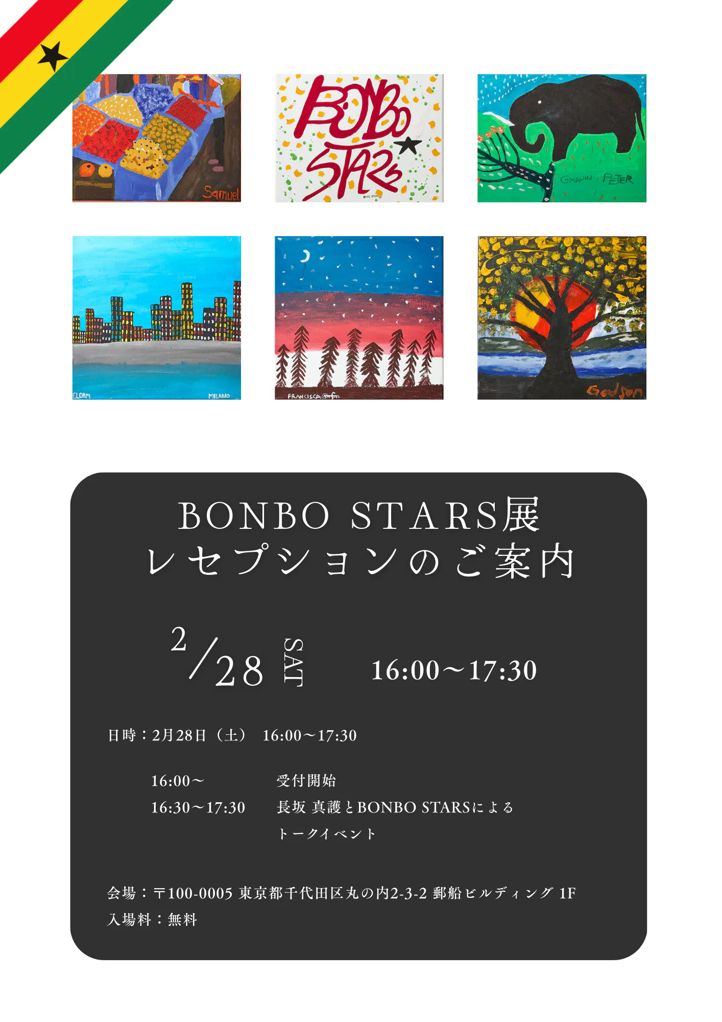 2026/02/22 15:47クラウドファンディングで応援してくださった皆さまへイベント情報をお知らせ申し上げます。この度、スラム街から生まれたアーティストたち「BONBO STARS」の展示会の開催を記念し、レセプションを開催する運びとなりました。【BONBO STARS展のご案内】アフリカ・ガーナのスラム街から生まれ、長坂真護がプロデュースしているアーティストたち「BONBO STARS」の2度目の単独個展が開催されます!作品の売り上げの10%が作家本人に給料として還元されています。彼らの多くはそのお金を学費に充てたり、家族のために家を建てるなど、それまでは叶えられなかった夢を叶えたり、自分たちの未来を切り拓くために使われています。そして2月28日(土)16:00-17:30には、レセプションが開催されます!BONBO STARSの画家本人が作品の解説をするトークイベントも実施します。プロデューサーである長坂 真護も参加予定です。詳細は添付いたしました資料に記載してございます。皆様のご来場を心よりお待ち申し上げます。★★★■ レセプション情報BONBO STARS展~レセプション~会期:2026年2月28日 16:00-17:30会場: 郵船ビルディング内 〒100-0005 東京都千代田区丸の内2-3-2 郵船ビルディング 1F入場料:無料★★★ もっと見る