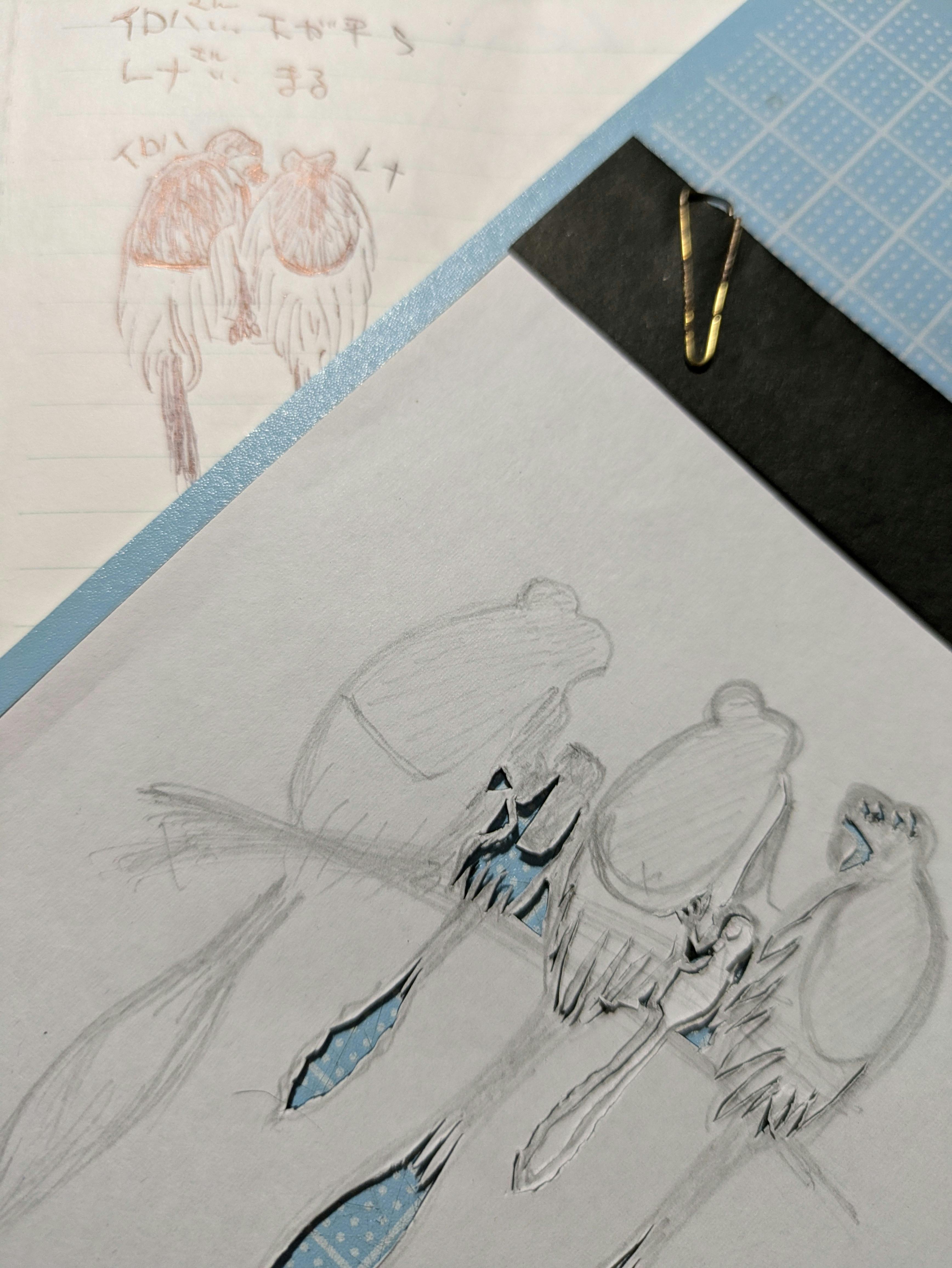表情をみたり、目は?鼻のかたちは?口は?頭は?指は?しっぽは? …あらゆるパーツとにらめっこしながら、気に入った瞬間を描き写してみたり。悩みつつ色いろ描いてみた結果