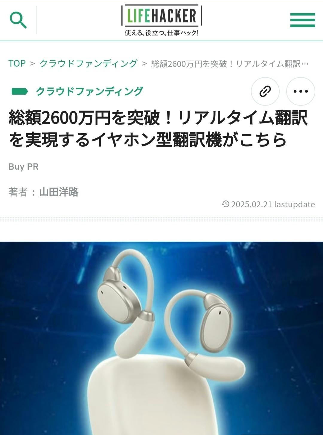 ▼記事の詳細はこちら「総額2600万円を突破!リアルタイム翻訳を実現するイヤホン型翻訳機がこちら」