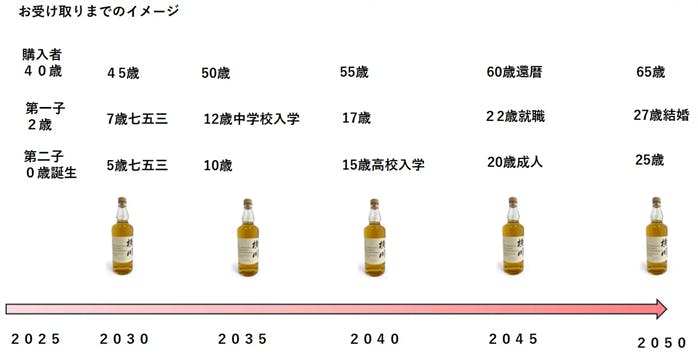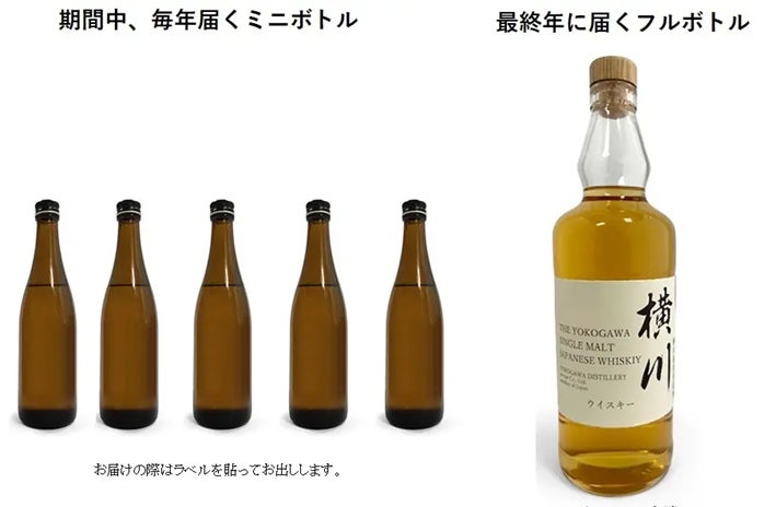 5年、10年、15年、20年、25年、毎年お届けするミニボトルと、最終年にお届けする1本のフルボトルで、未来のあなたと、あなたの大切な人が交わす乾杯を、特別な思い出にします。