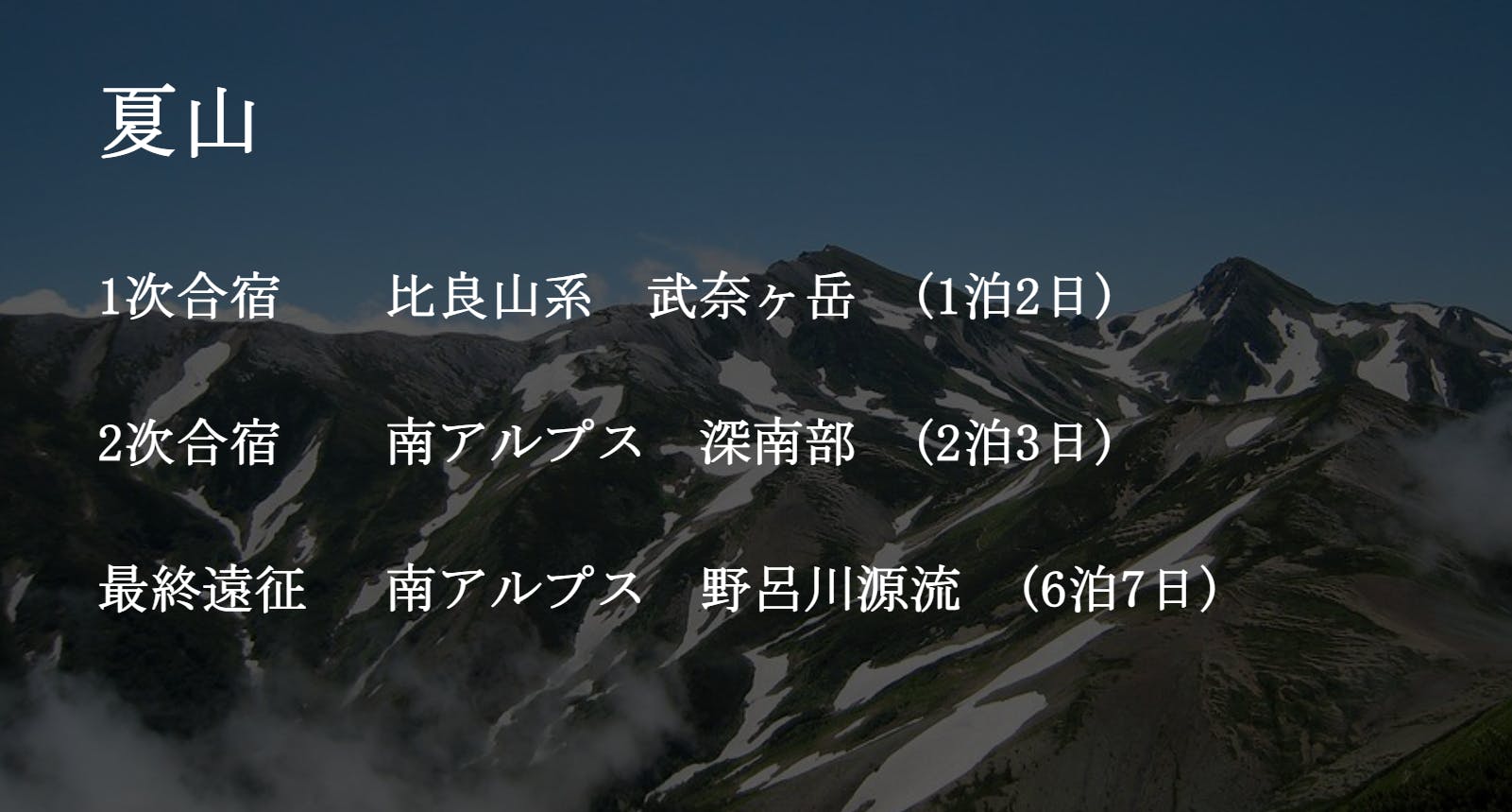【2024年度夏山活動報告:武奈ヶ岳(1泊2日)⇒南アルプス深南部(2泊3日)⇒野呂川源流(6泊7日)】