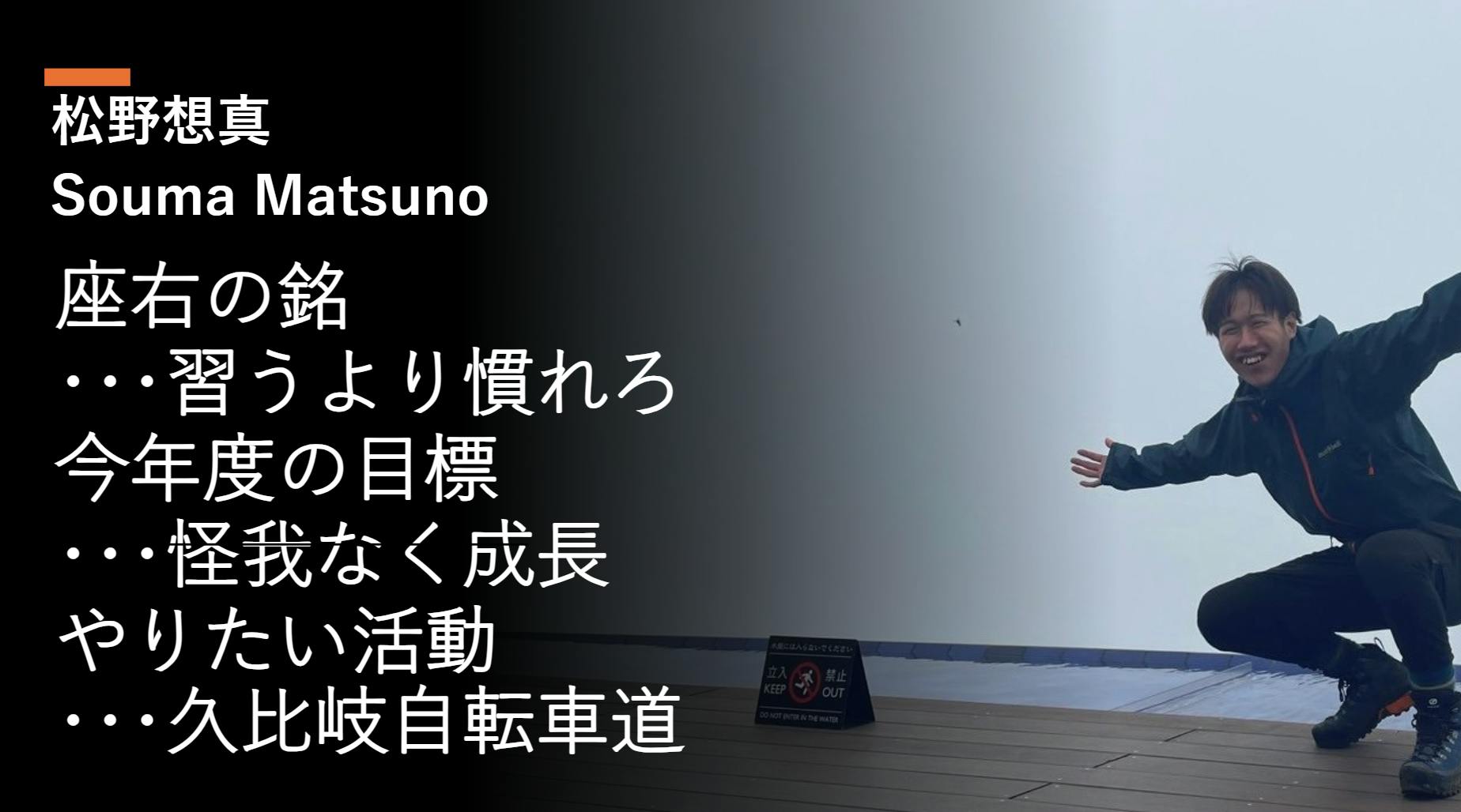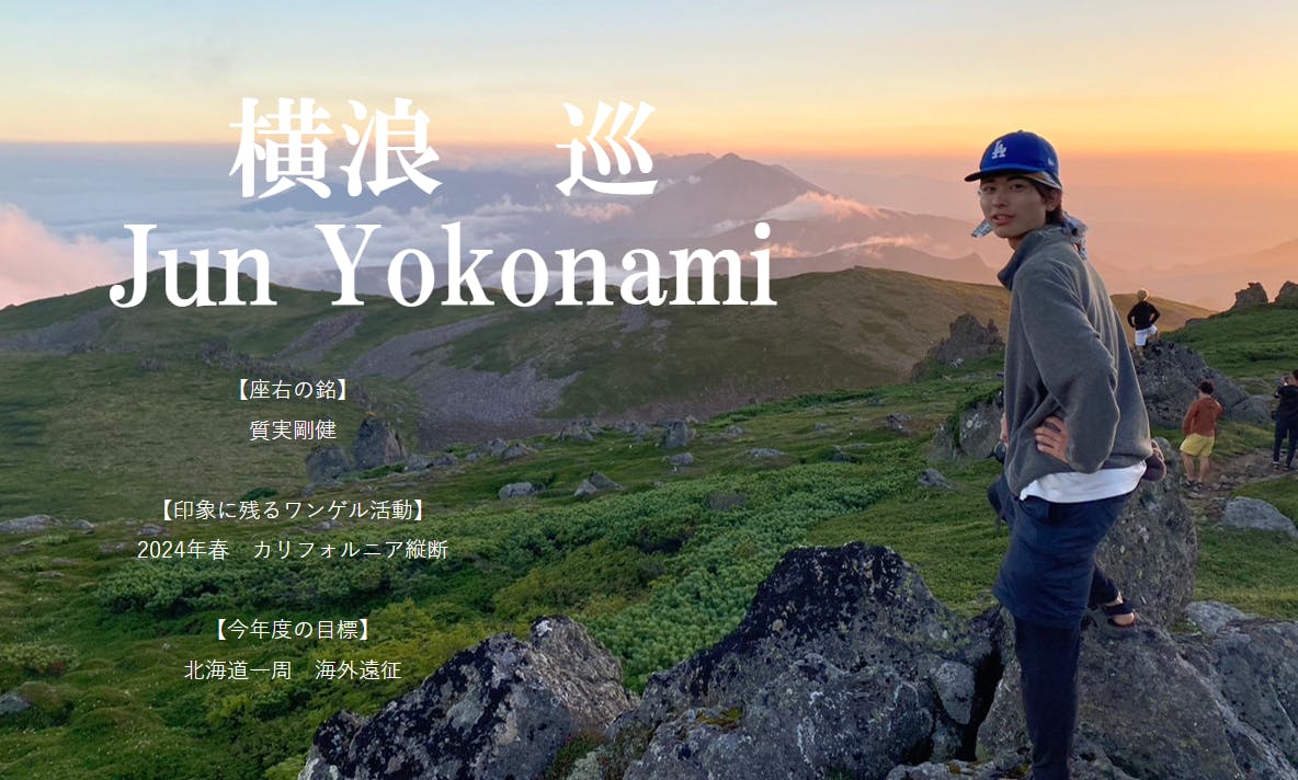 「足は太くとも、顔は真っ黒に焼けても、そこに道がある限り私たちは自然に挑み続ける」これをモットーに2年間活動に向き合い、メンバーと切磋琢磨し合いながら自分自身を高めてきました。2023年度はカナダ留学のために部からは離れていましたが、今年からまた活動を再開し、改めてワンダーフォーゲルの楽しさを実感しています。現役最後の活動となる本合宿を完遂すべく、今現在就職活動をしながらトレーニングに励んでいます。ご支援いただけると本当にうれしいです。よろしくお願いいたします。