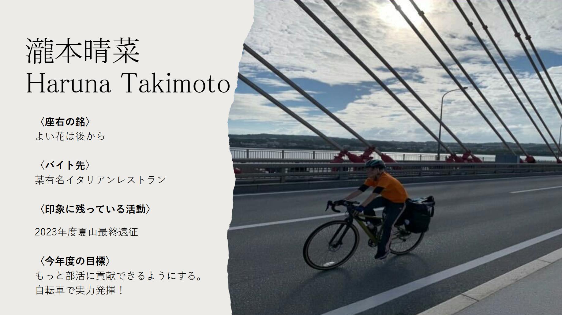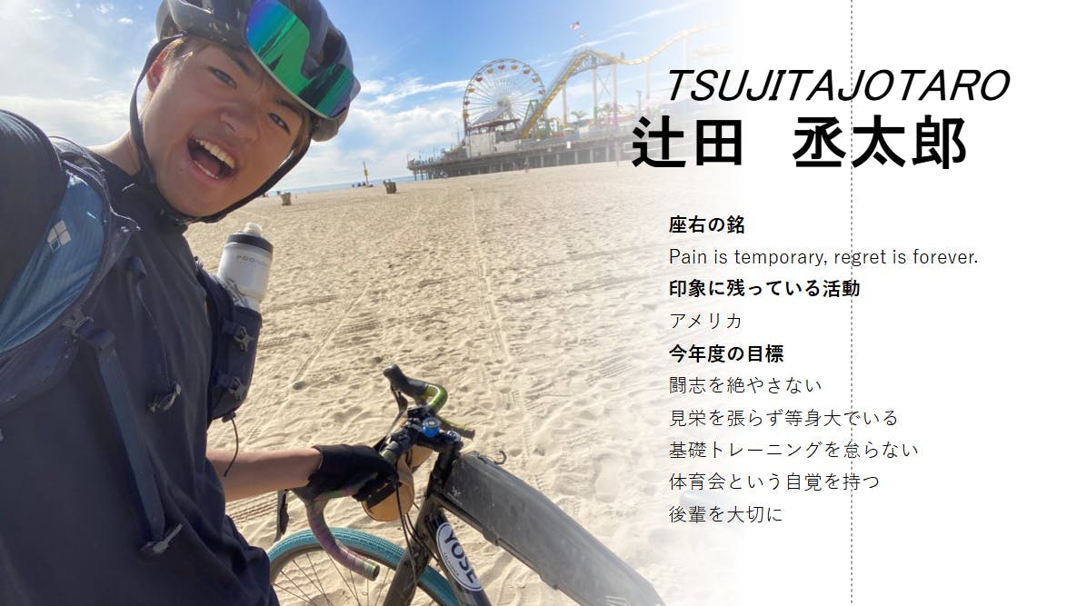 自転車班所属の彼のチャリに対する情熱はマグマより熱く、季節問わずいつでもハンドルを握っているイメージがある。山における体力は群を抜いておりどんなに離れていても遠くから元気な声が響いてくる。常に全力でトレーニングにも熱心。自ら遠出し一人でもやりたいことをやるという行動力もある。泳ぎが苦手という意外な一面もあるが、どうやらトライアスロンのためにこの弱点も克服するとかしないとか。合宿では彼のパワーを生かして仲間をサポートし、合宿の成功確率を向上させる頼もしい部員になって頂きたい。