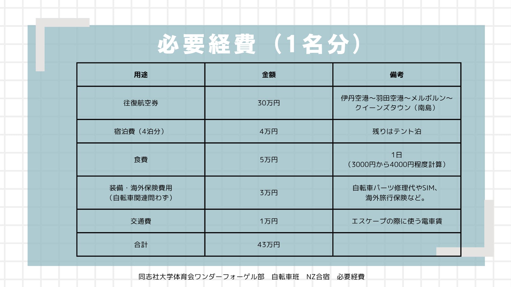 私たち同志社大学体育会ワンダーフォーゲル部自転車班は、NZ合宿に挑戦するうえで上記の目標を掲げています。これまでの経験を積み重ね最終合宿を完遂させることによって、世界に元気と勇気を与えたい。「大学生が出来ることは大したことない。」