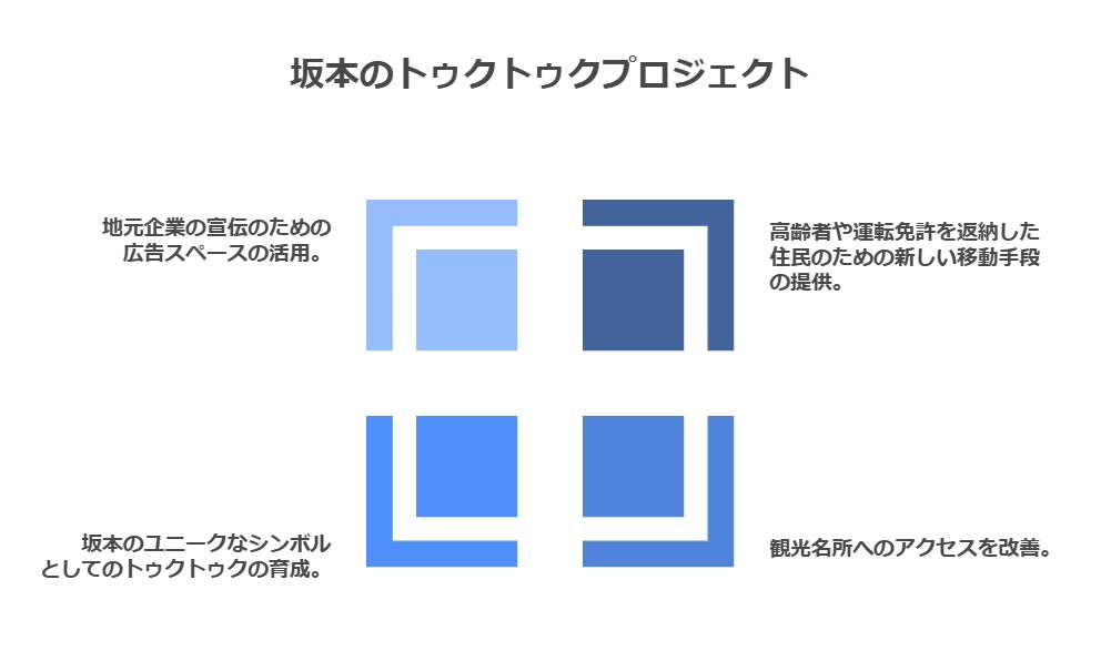 トゥクトゥクの車体に広告を掲載し、地域の企業や観光施設のPRを行いながら運営資金を確保することで、持続可能なサービスとして運営していく計画です。このように、トゥクトゥクは坂本の観光資源を活かし、地元住民や訪問者にとって価値のある存在となる可能性を秘めています。