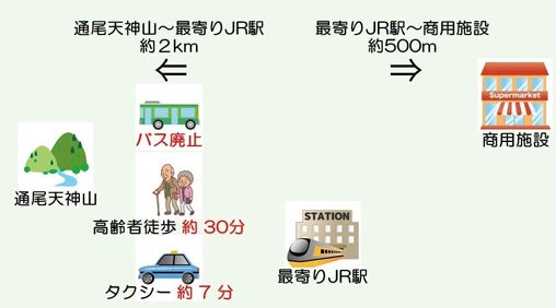 最寄りの商用施設までは約2.5km、徒歩で約25分、ご高齢者の足では約40分もかかります。そのため、自動車を運転することに不安を覚える高齢者の方々の中には、徒歩で買い物に行かざるを得ない方も多い状況です。