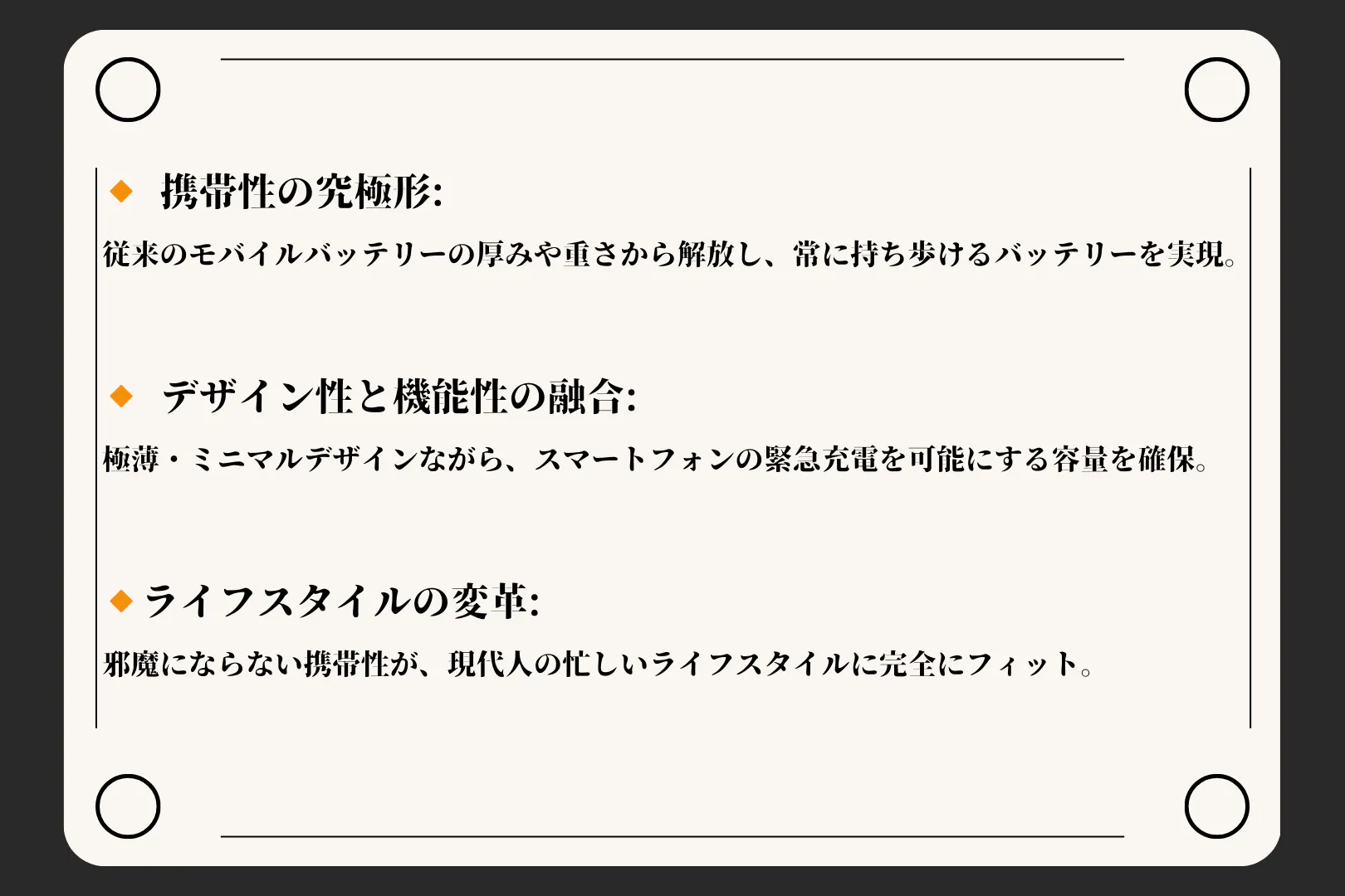 この製品は、モバイルバッテリーの「持ち運びたくない」「重い」「かさばる」という課題を根本から解決し、日常の困りごとをスマートにサポートします。