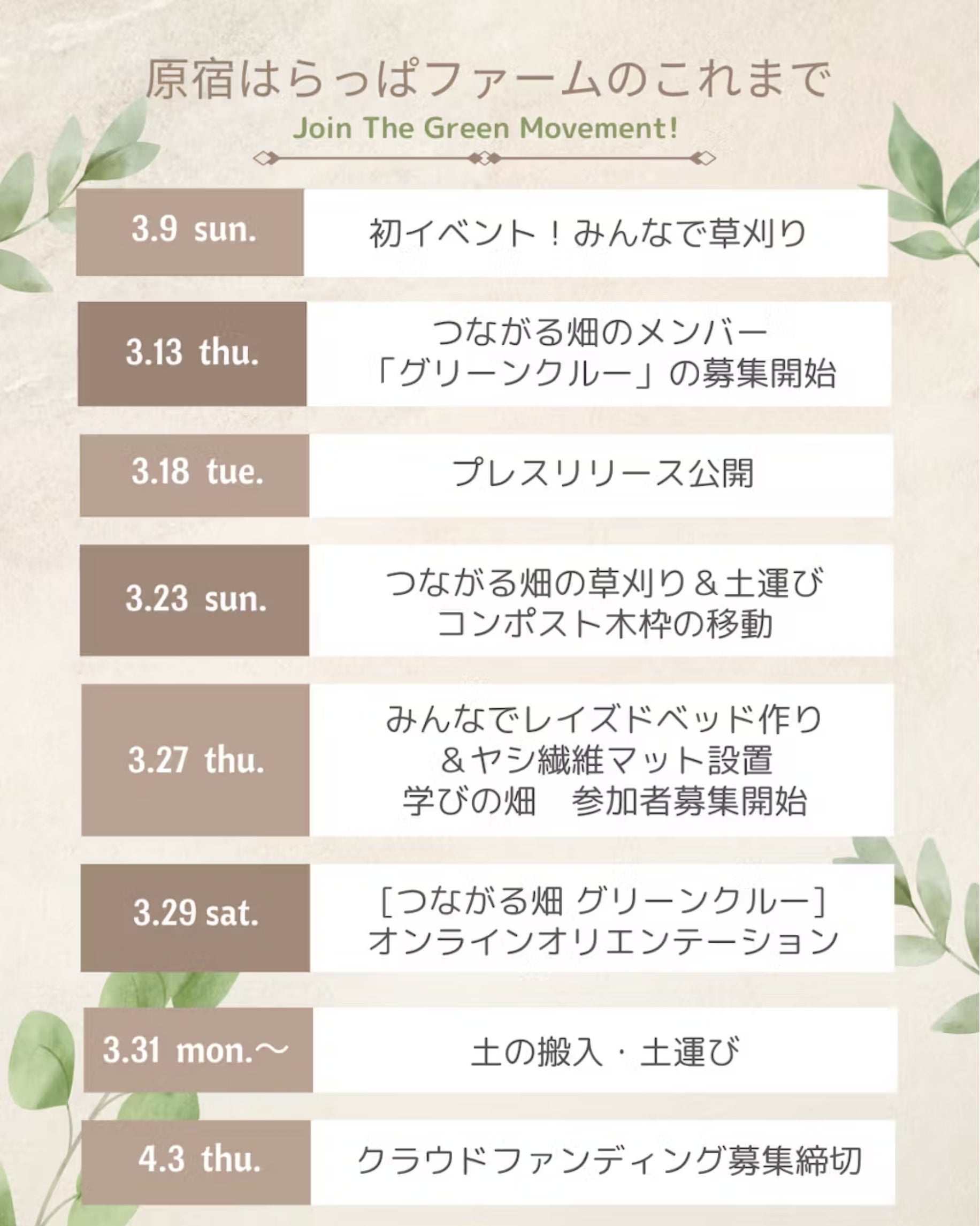 クラウドファンディングへのご支援ありがとうございました!4月3日23:59にクラウドファンディングが終了!208人の支援者さんから総額1,778,500円のご支援をいただきました!目標達成率は53%となりましたが、最終日の最後まで支援へのお申し込みを続々といただき、こんなにも多くの方から応援や期待をいただけたことに感激です!水道工事(水道栓2か所引き込み)、畑枠や丸太、コンポスト&ココナツのマットレンタル、リターン準備、人件費などの代金にさせて頂きます。本当にありがとうございました。原宿の1500㎡の空き地(しかも国有地)にみんなの畑を作るプロジェクト。このクラウドファウンディング支援募集の最中にも、様々な活動を進めてきました。“1年しかないよ” “本当に畑になるのか” という“はらはら”ファーム。畑になってきましたよ!着々と畑の姿へと実現が進んできた、これまでの様子をご報告します。1年限定“はらはら”ファームが本当に畑になってきた!2/22 クラファン用写真撮影クラファンのカバー写真を、国有地隣 TWIGGY.さんの屋上から撮影させて頂きました。仲間やTWIGGYさんの方々と畑になることを喜びました。3/9 初のイベント!みんなで草刈りお天気良好!やる気満々で集まったメンバー。これから広大なはらっぱが、どんな畑になるのかな、と思いを馳せながら草刈りをしていきました。3/13-20 つながる畑のメンバー、「グリーンクルー」の募集開始8人1組で菜園を運営する「つながる畑」はパリのコミュニテイ菜園のやり方をお手本にしたグループ菜園。育てる作物をみんなで決めるところからスタートし、日々のお手入れを分担し、収穫物をみんなで分かちあいゆるやかに温かにクルーがつながり合うことを大切にしていきます。種や苗もグループで調達します。3/18 プレスリリース公開プレスリリースはこちらからご覧いただけます。シェア大歓迎!3/23 つながる畑の草刈り&土運び、丸太とコンポスト木枠の移動原宿は快晴、絶好の草刈り・作業日和でした!つながる畑の草刈り&土運びみんなで「つながる畑」(チームで一緒に作る畑)エリアを楽しくおしゃべりしながら草刈りしました!大人も子どももみんなで協力し、草が取り除かれてすっきりしてきました。また、畑で使用する土も運び込み、ファームオープンに向けて着々と準備が進んでいます☺。コンポスト木枠の移動「ののあおやま」さんのコンポスト木枠をはらはらファームへ移動しました!ののあおやまさん、ありがとうございます。1年間お借りし大切に使わせていただきます!@nonoaoyama丸太の搬入みんながほっとして座れる椅子となる丸太が、埼玉県の飯能からやってきました。この丸太は「西川材」杉の木で、「西川材」は江戸時代から続く、木材の色・艶が良く、年輪が緻密で節の少ない木材として知られています。とっても重かったですが、みんなで協力して無事搬入することができました!これからたくさんのお尻をのせてくれます!丸太がファームの真ん中にあるだけで、安心感があります。この丸太をはじめ、ファームで使用された材料は可能な限りd循環できるものになっています。丸太も使用後は小さくなって形を変え、別のところで使われる旅をしていく。この丸太はそんな循環のシンボルにもなっています。3/27 みんなでレイズドベッド作り&ヤシ繊維マット設置イベント報告この日も青空が広がり、日差しが気持ち良いお天気!30名以上と多くの方にご参加いただき、ファームの作業を一気に進めることができました。ヤシ繊維マット設置植物繊維100%、ココナッツ繊維製のSDGsを意識した製品、ココペーバー。 @cocopaver_okayama以下のような特徴があります。・木を伐採せず実だけを収穫 ・普段は捨てられてしまう部分を活用・防草効果がある ・植物繊維100%でいずれ土に還る!はらはらファームの出入口エリアにこの耐久性のあるマットを敷くことで、バリアフリーになり、車いすやベビーカーでも通行できるようになりました。コロコロ転がしながら敷き、あっという間に設置完了!ココペーバーの上にみんなで寝そべってみると、ふかふかでいい気持ちなのです。コンポスト木枠の組み立て「ののあおやま」さんよりお借りした木枠でコンポストを組み立てました。これから畑で使う堆肥を作っていきます!@nonoaoyamaレイズドベッド(畑の木枠)組み立てレイズドベッド(raised bed)とは地面から立ち上がった枠状の栽培スペースのこと。皆さんで協力し、つながる畑・学びの畑・実験の畑それぞれの木枠の組み立てが完了しました!今後この木枠の中に、土や堆肥を入れ野菜栽培に向けた準備をしていくことになります。丸太の皮剥き/移動&設置この丸太の樹皮を、刃を下に滑らせて剥いていきました。皮剥きの後はみんなで協力し、重い丸太を畑の木枠まで運び設置。素敵なベンチが完成しました!みんなで草刈りまだまだ続きます、草刈り!(というか根っこと石の除去)3/27 学びの畑のメンバー=グリーンクルーの募集開始学びの畑は原則月1回