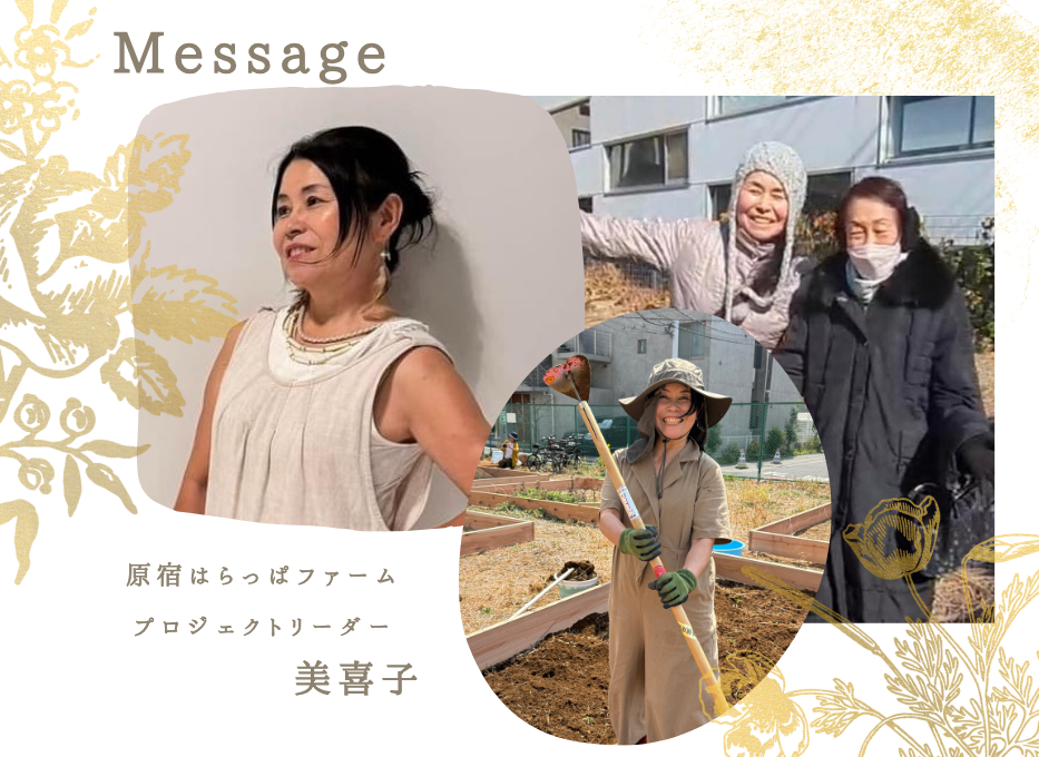 ⚘𖤣𖥧𖥣𖡡𖥧𖤣 まえがき 𖤣𖥧𖥣𖡡𖥧𖤣⚘初めまして、原宿はらっぱファーム発信担当のあっきーです。クラファン残り1日!これからリーダーの美喜子さんをはじめ、メンバーの皆さんからのメッセージをこちらでお伝えしていきます。❁美喜子さんの動画によるメッセージはInstagramでご覧いただけます。こちらをクリック → 前編 後編〜私たちは循環するひとつながりの「いのち」〜それを表現する活動原宿はらっぱファーム プロジェクトリーダーの美喜子です。コンポストアドバイザーとして、コミュニティコンポストを取り入れたい方々へ、講座や講演、コンポストの準備サポートの活動中です。過去には絵描き、催眠療法や心の教育相談員など心に関わる活動もしていました。これらの活動は全部つながっているなと思っています。それはつまり、私たちは循環するひとつながりの「いのち」ということ。この思いをさまざまな活動を通して表現しています。 10年以上も思い続けてきた願い。都心の「国有地」を畑で活用という奇跡を多くの方からの支援で実現遡ると2012年から2013年頃にかけて、都心の真ん中、表参道などで植物を介して人が集まる、循環を大事にした暮らしをしたい思いが強く湧いてきたんですよね。ですが都市の真ん中で畑をしたり植物を植えることって、ものすごくお金がかかるし、知ってる人もいないし、無理だなと思って。ずっと、いつかね、とそう思っていたんです。そこから本当にいろいろなきっかけがあり、コロナ真っ只中で原宿周辺に移ってきました。本当にやりたいことをやろうと腹をくくってやってきたんです。すると、たまたま近所に「国有地」と書かれた誰も入れないはらっぱがあって。私達は屋上のプランターでしか野菜を育てられない状況なのに、渋谷区ではとっても貴重なこの土地が本当にもったいないと思いました。ですが、国の土地は無理だろうと思いながらも、畑にさせてもらいたいと独り言のようにずっと言っていました。そのはらっぱを通るたびに、「みんなのためになるようなことをするから、私に貸して!」って言って。その後、2023年に都市農地活用支援センターというところでこの国有地のことを相談してみました(私はそこで現在もアドバイザーをしています)。すると、そこから国有地を管轄する財務省や農水省、国交省に連れて行ってくださり、自分の企画を一緒にお話することができたんです。最終的には、昨年の秋、渋谷区が快く間に入ってくれて国有地を渋谷区が管理するという契約を結んでくださいました。私たちは渋谷区から再委託という形で、その土地の活用方法として畑があり、管理しながら畑もやっていいという形で進んでいます。というのも国有地は自治体か町会でないと契約できないことになっているんです。過去にさまざまな方がその土地の活用を試みられたようですが、どこも実現には至らなかったところを、奇跡的にここまで至ることができました。名が知られているわけではない私が、です。ここまで実現できた背景には、本当にいろんな方にお世話になってきたことが大きいです。直接的なことだけでなく、私がコンポストのことに集中するあまり疎かになってしまうことや金銭面でのこと、そういった時にいろんな形で皆さんが助けてくれましたね。本当に感謝です。「原宿」という一等地の広大な畑で実現したいことこのプロジェクトの場所は、1500平方メートルの国有地で、原宿駅から1kmぐらいのところにあリます。都会にしては広いはらっぱなんです。そこを「原宿はらっぱファーム」と名付けてもらって、“はらはらファーム”とみんなで呼んでいます。 渋谷区の地域住民と支援者で作る「都市農地と防災のための菜園協議会」と、地域の方々と菜園の専門家などが集まってできた仲間が契約しています。1年間限定で国から渋谷区に管理委託される形ですね。実現したい内容は・都心でも美味しい野菜を自分で作れること・生ごみや捨てられている有機物を土に還すと、土が元気になること・自然の循環に沿った生き方を大切にしていきたいということ以上のことを主に進めていきます。「防災」という内容も含まれていますので、防災に関する取り組みもこの1年の間にできればと思っています。ファームの実験的な取り組みで地域のつながりを作り、この先、そして全国へはらはらファームでは、地域の生ゴミやその他の有機物を堆肥化するという実験をしていきます。そのほかにも実験的なこととしてさまざまな案を考えています。具体的には、石膏ボードを土に混ぜることや堆肥の有無での比較、また、ファームの近所に「おたふくわた」さんという創業180年以上の会社があり、廃棄されている大量のお布団の綿を土に入れる実験もやりたいと思っています。期限が1年しかないのにファームをやるというのは、大変チャレンジングなことなんですが、それでもやろうと思ったのは、4年半の間ずっと抱え