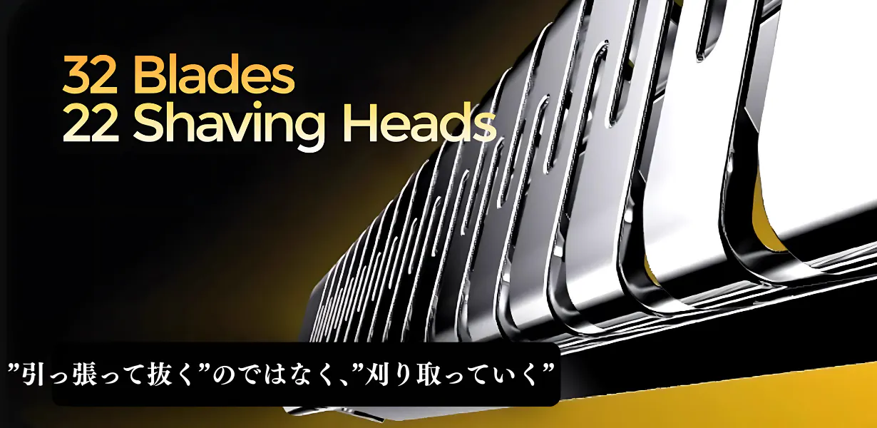 32枚の精密な刃が、22のヘッドとなり、ヒゲを”引っこ抜く”のではなく、”刈り取っていく”。