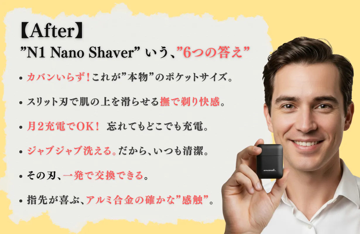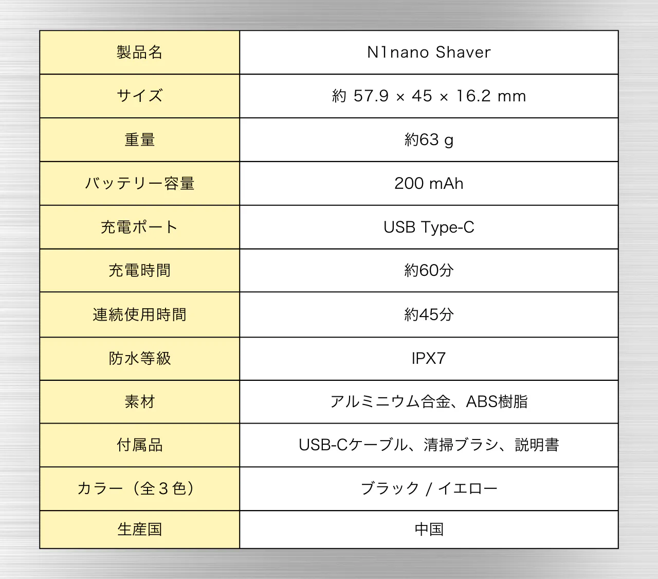 そう、N1 Nano Shaverを手に入れることは、単に道具が一つ増えることではありません。その日の気分やコンディションに合わせて、”オプションを、自由に選べる”という、”贅沢な選択肢”を手に入れることなのです。