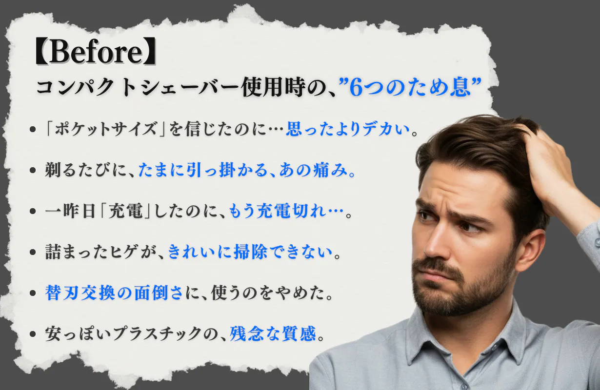 「シェーバーを持ち運ぶ」そのために、せっかくの休日まで、あの重たいカバンと一緒ですか?「念のため」という、その小さな”気合”が、あなたの自由を、少しずつ奪っていく。