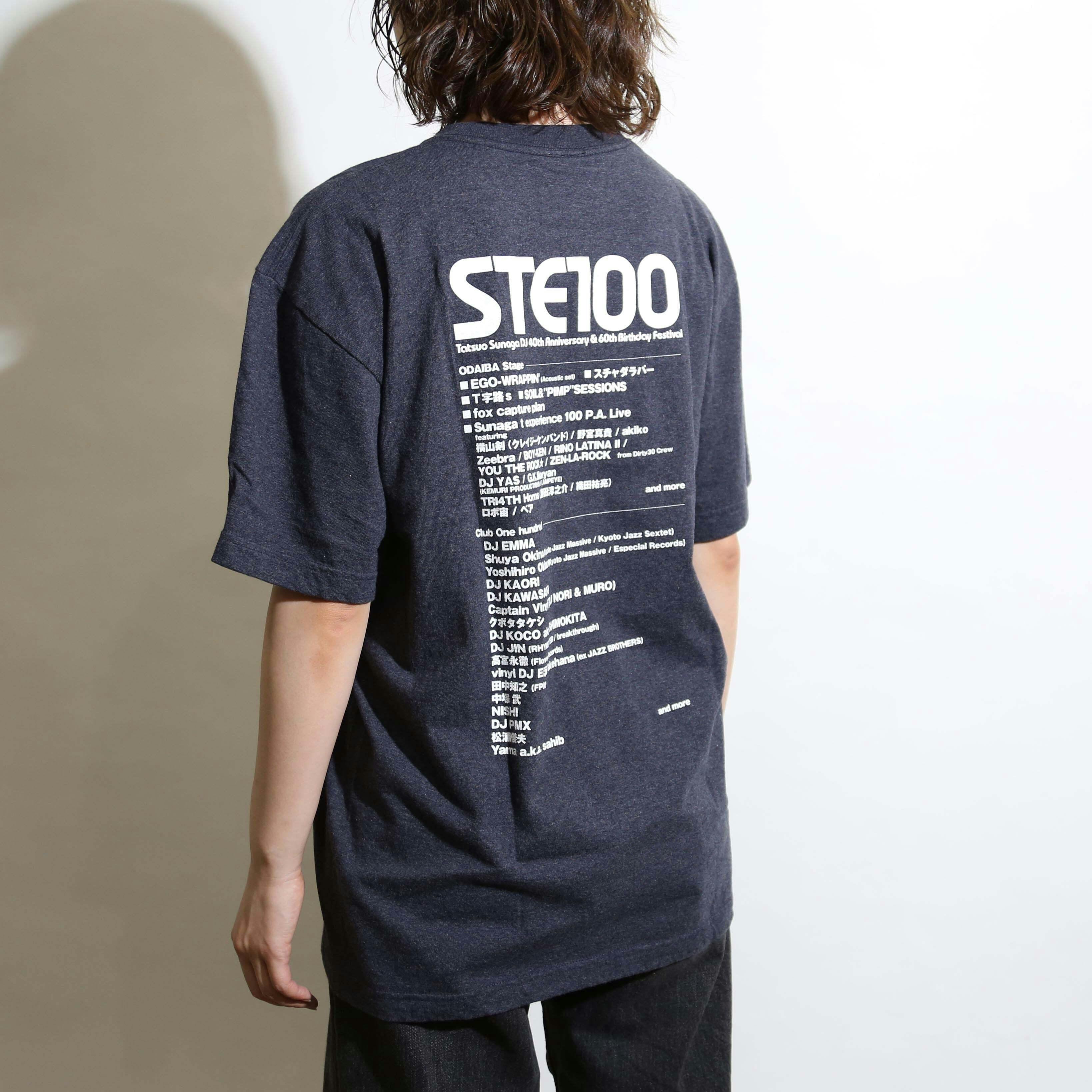 吉永祐介によるコルトレーンオマージュなSTE100 EPのジャケットデザインを表面に配置しました。プリントラバーインクの良い部分でもあるベタっとした風合いが今回のグラフィックの場合は、重くなりすぎると判断し着心地、デザイン性を考慮し着色抜染加工を採用しました。マニアックな加工ですが、テストを繰り返し細かい文字を綺麗に表現したかったので、結果4色印刷に構成しました。特注素材で肌触りも○