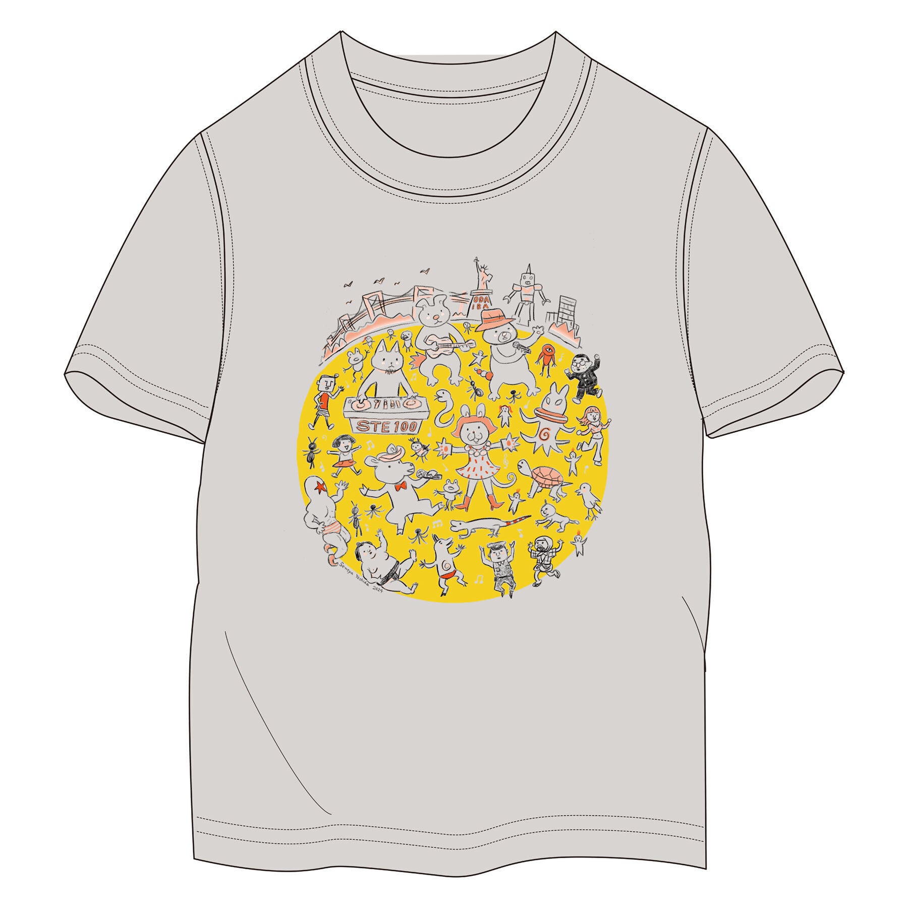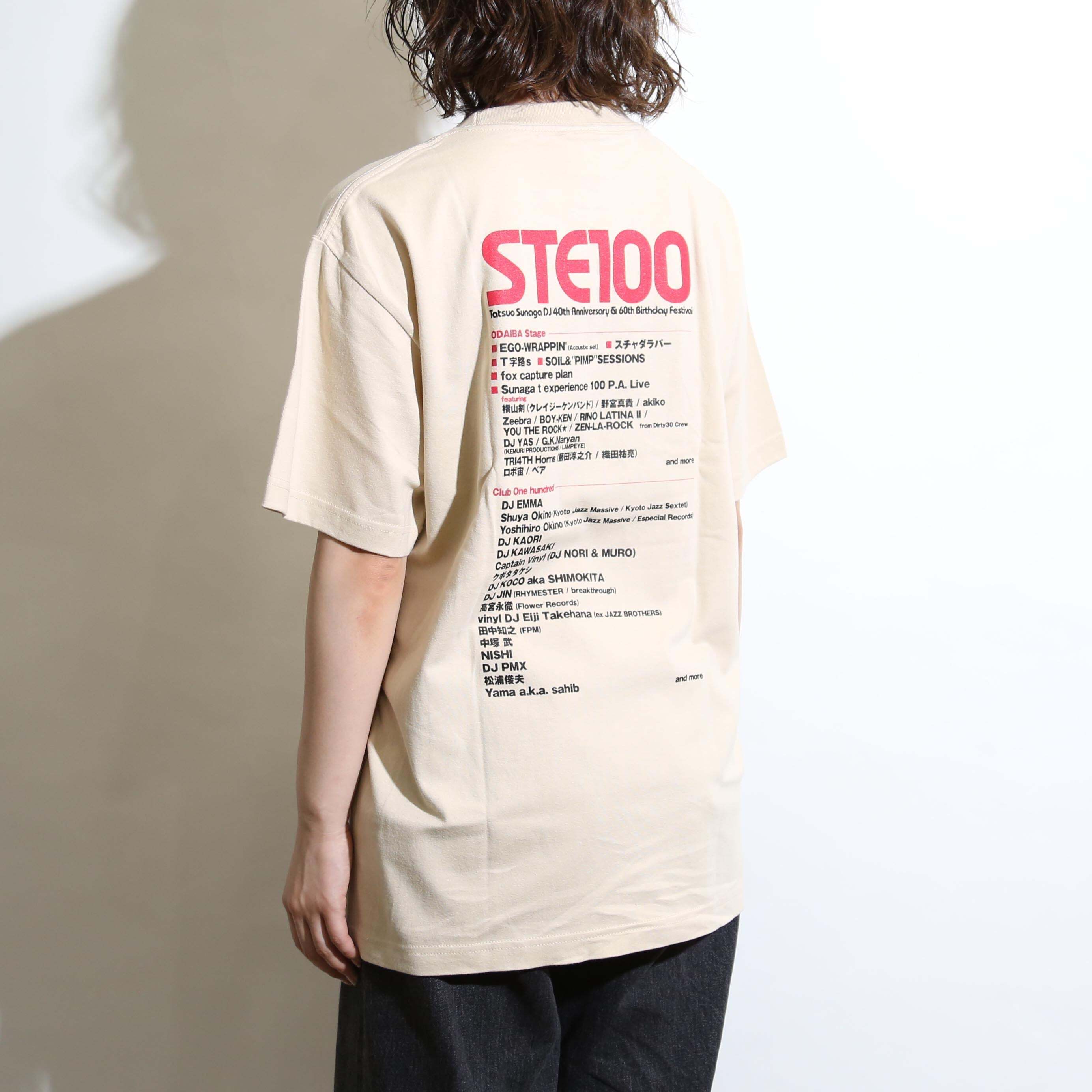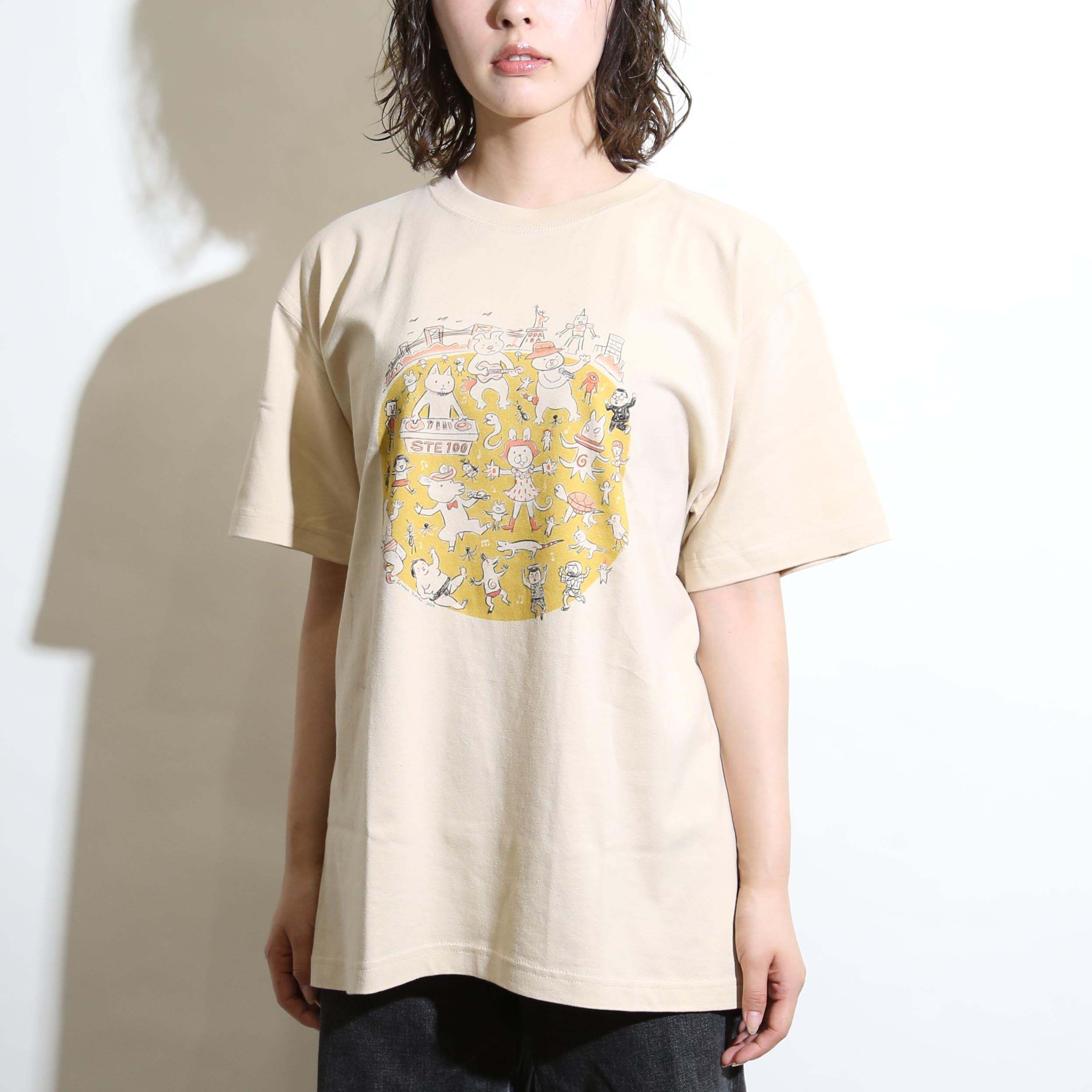 漫画家・吉田戦車氏に描いて頂いたSTE100のキービジュアルをデザインに据えました。作風イラストのタッチ、質感を考慮し染み込みの風合い、生地色ベージュとの親和性をだす為に印刷テストを繰り返して仕上げました。着心地を優先したフルカラー印刷を採用した高級モデルです。