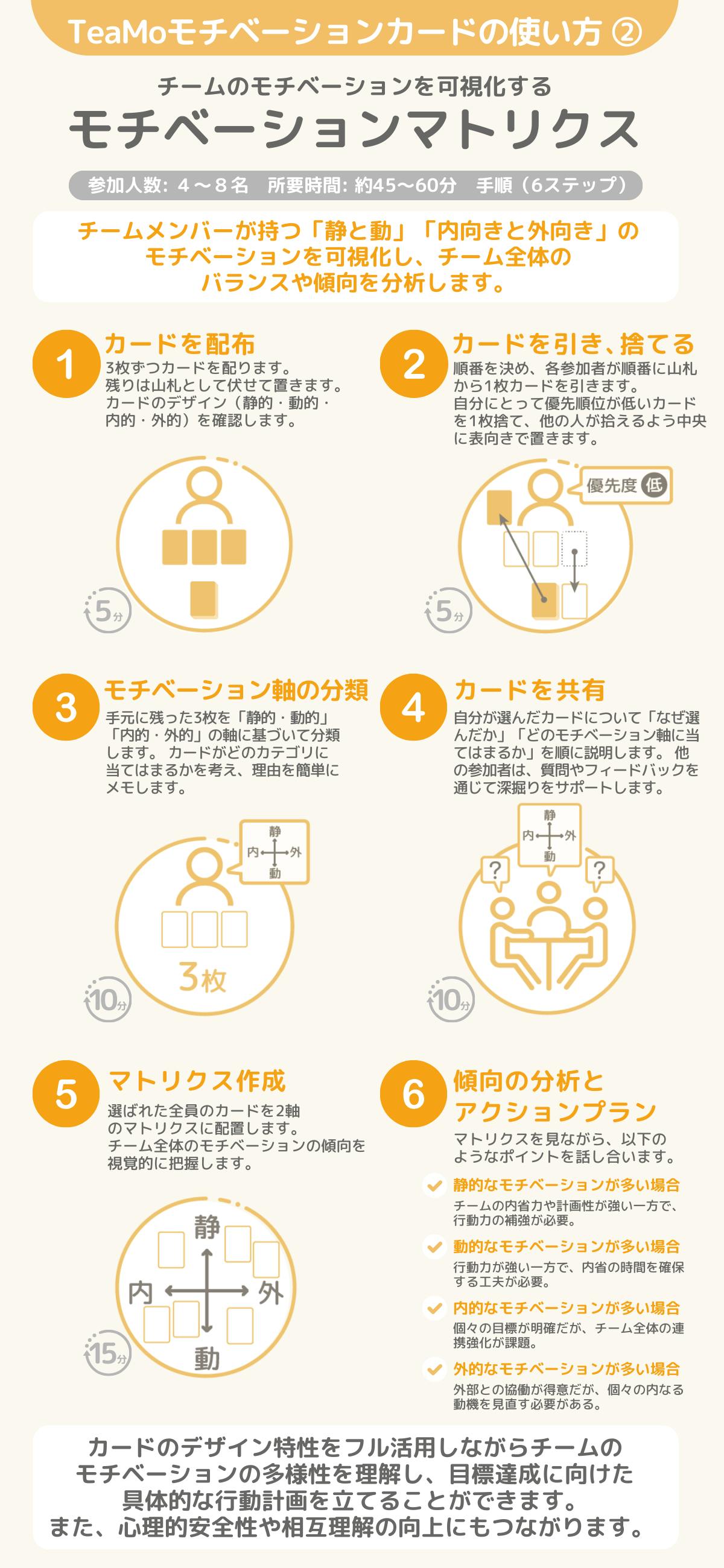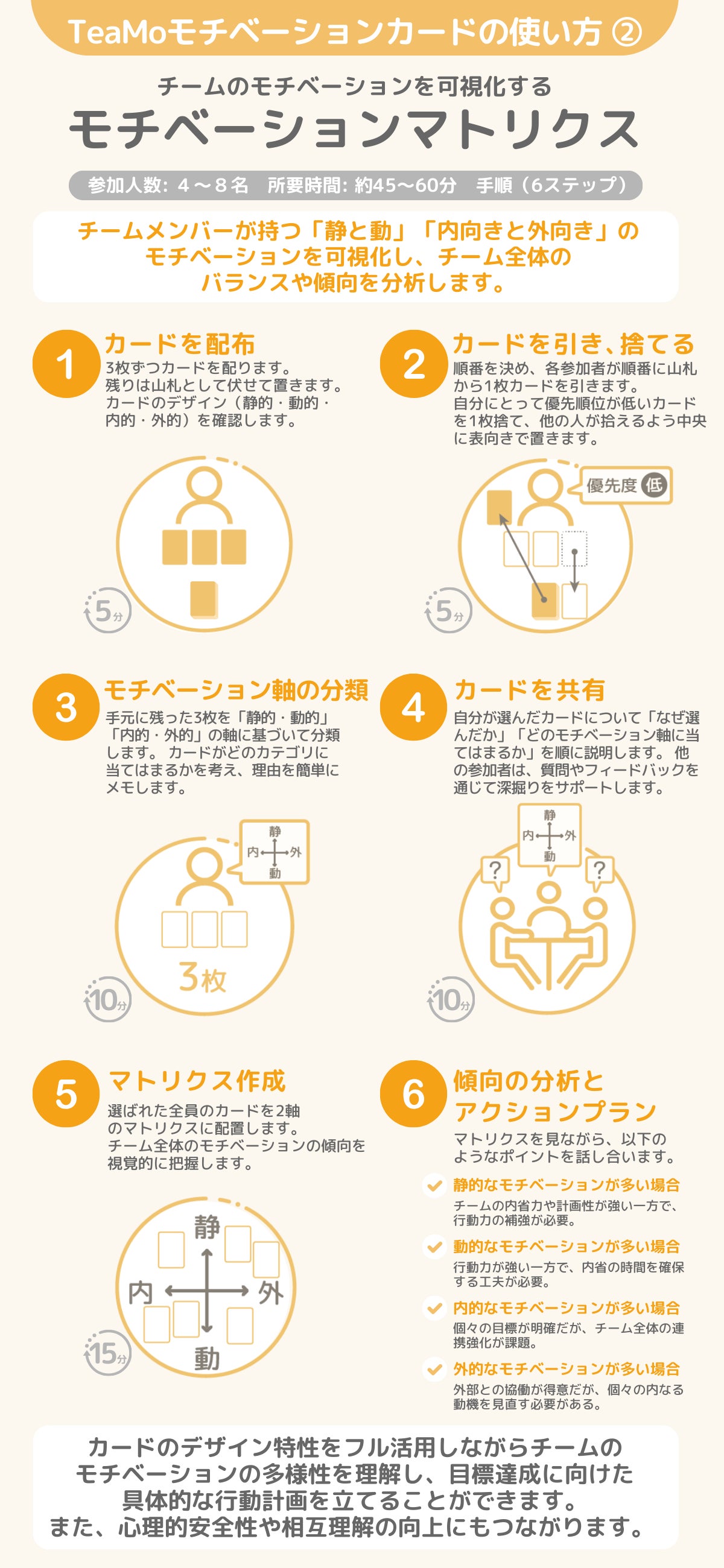 全52種類のカードは「内向き・外向き」と「静的・動的」の2軸のマトリクス(4象限)で分類され、モチベーション特性を視覚的に把握できるデザインとなっています。