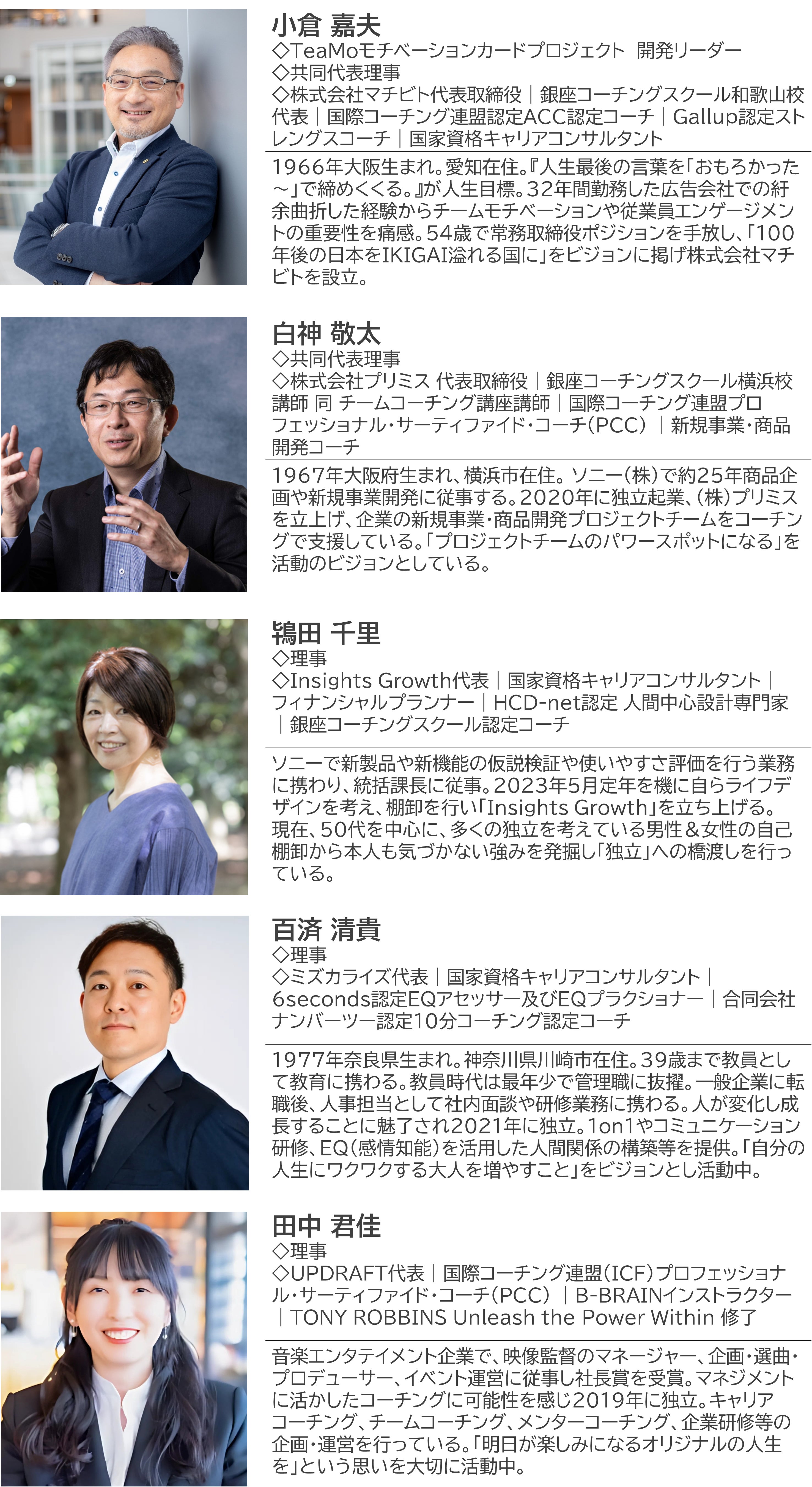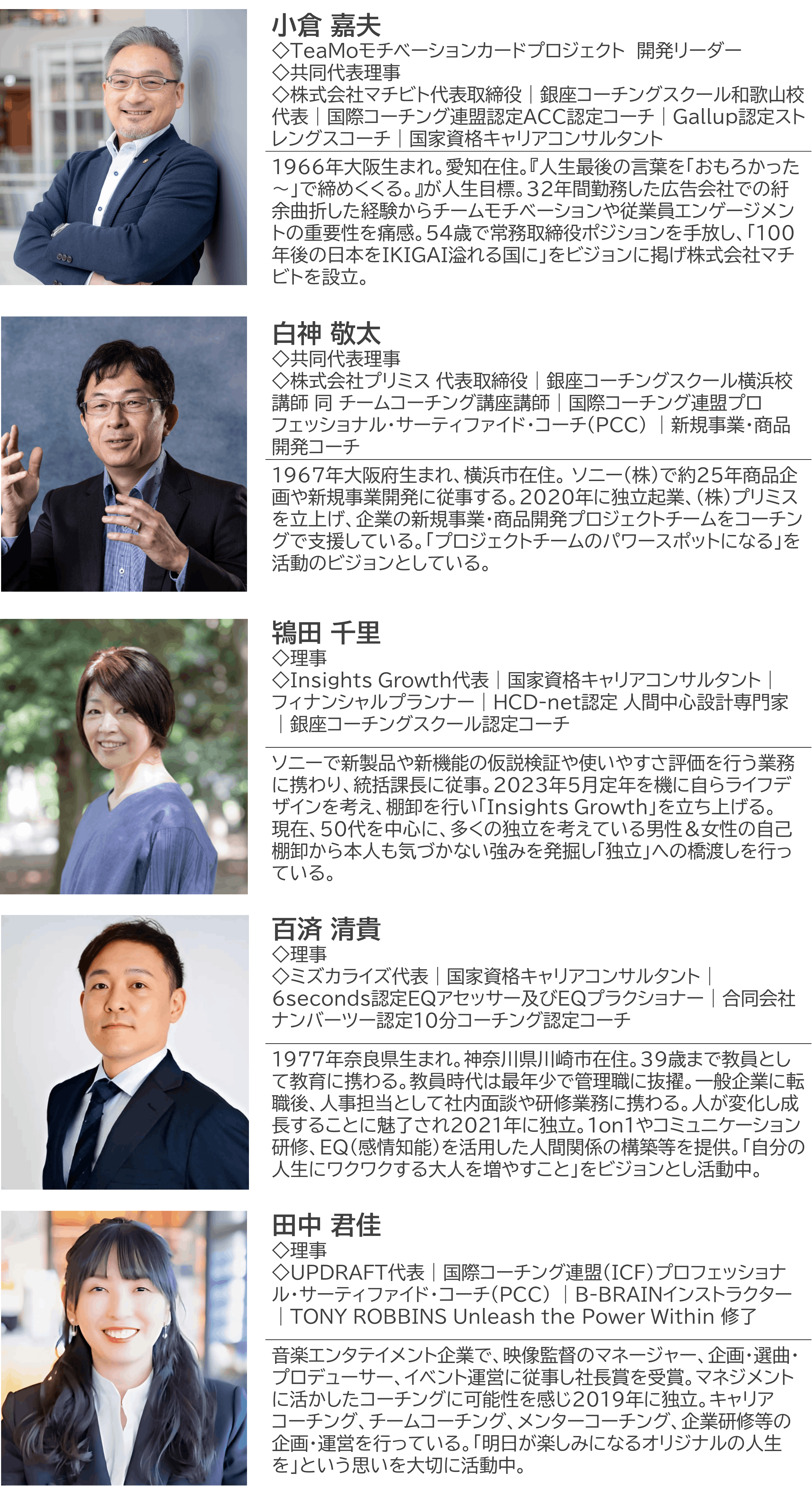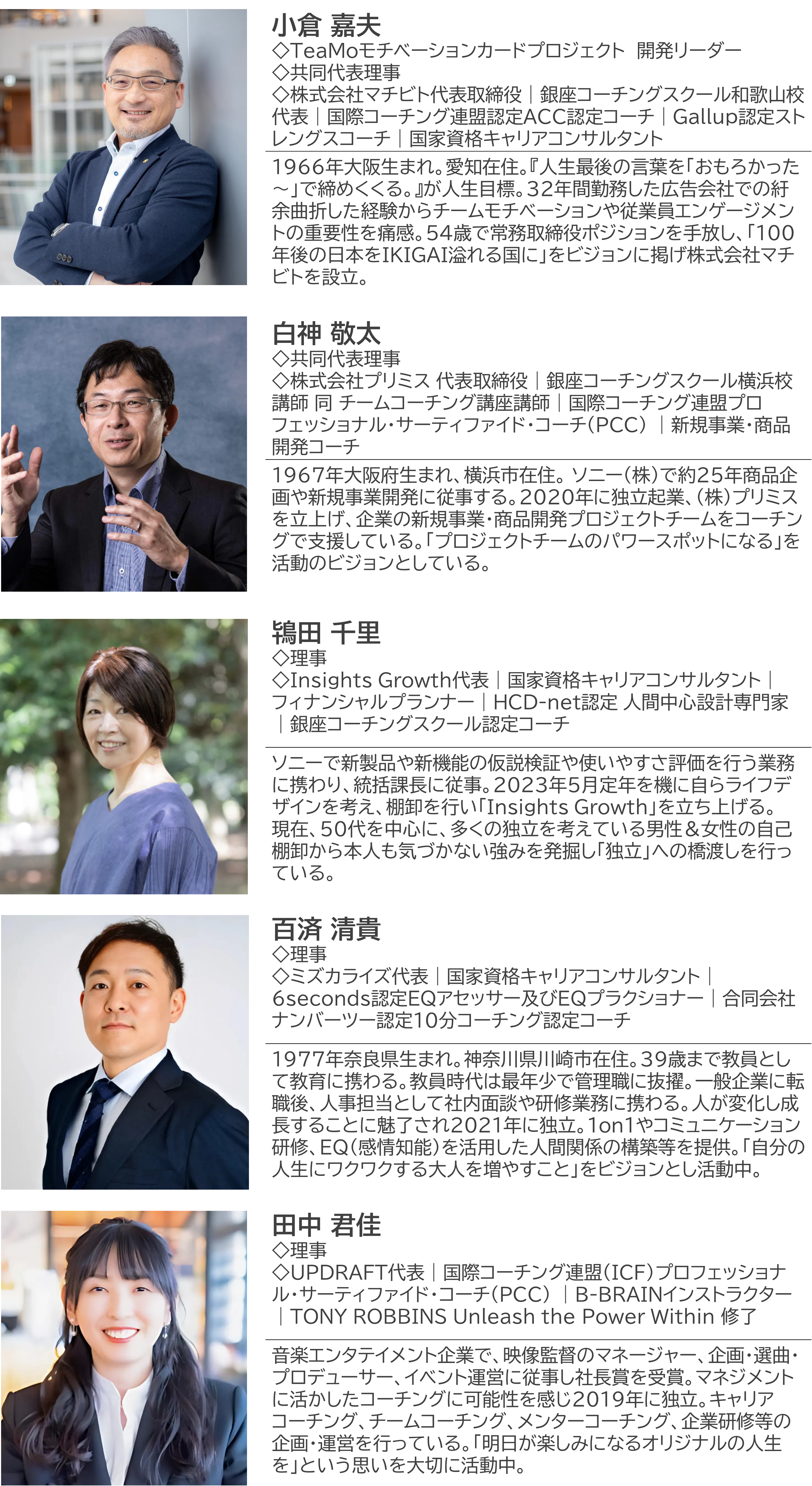 コーチングのプロが集まって立ち上げた「一般社団法人日本チームモチベーション協会」の代表を務めております。当協会では、モチベーションという”見えないもの”を可視化することで、働く人たちがイキイキ働けるチームづくり、そしてコーチングやキャリアコンサルタントなど対人支援者が活用できるツールや認定資格を提供しており、このたび新たに「TeaMoモチベーションカード」を作ることになりました。