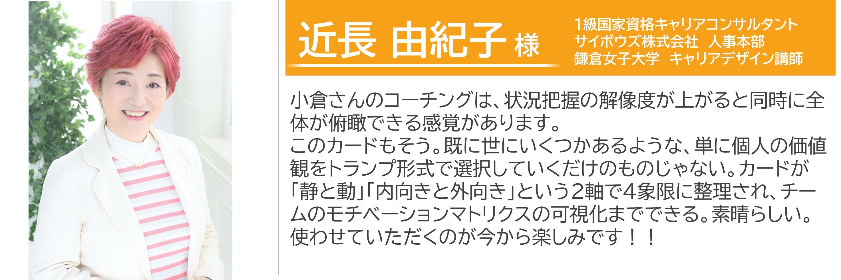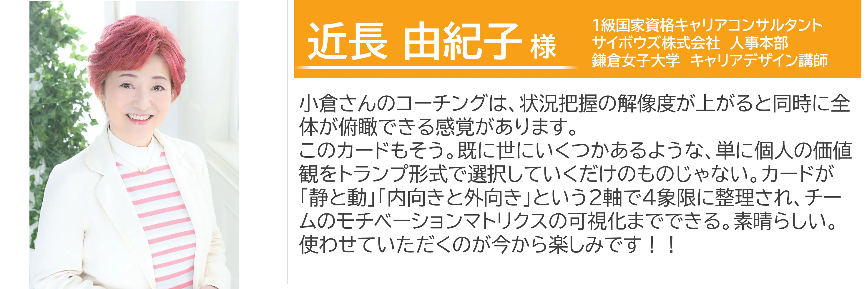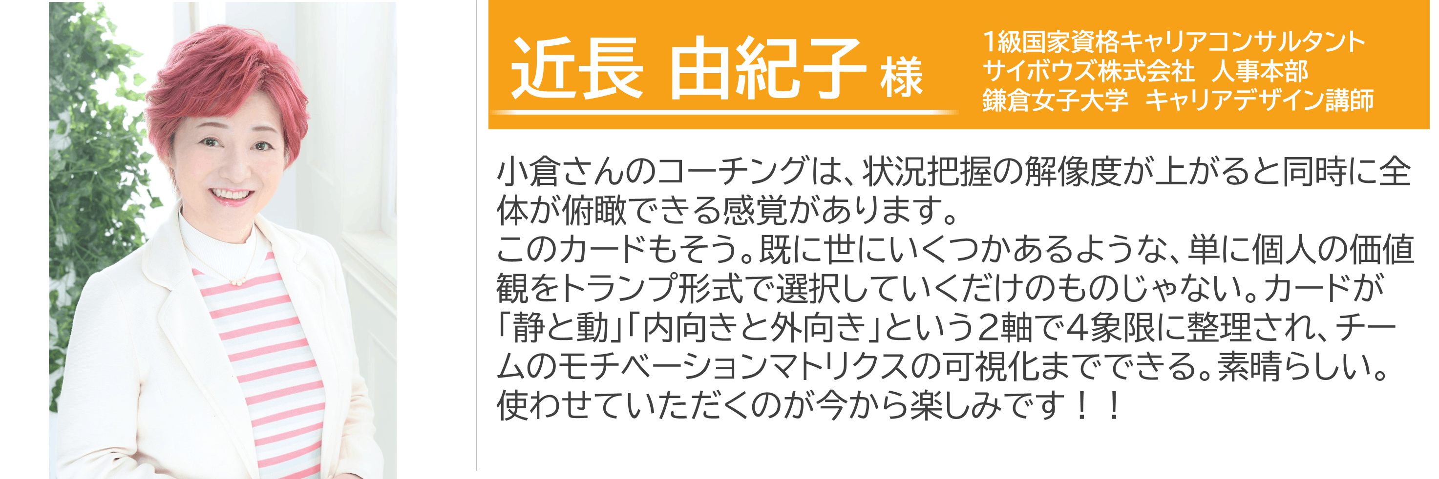 コーチングのプロが集まって立ち上げた「一般社団法人日本チームモチベーション協会」の代表を務めております。当協会では、モチベーションという”見えないもの”を可視化することで、働く人たちがイキイキ働けるチームづくり、そしてコーチングやキャリアコンサルタントなど対人支援者が活用できるツールや認定資格を提供しており、このたび新たに「TeaMoモチベーションカード」を作ることになりました。