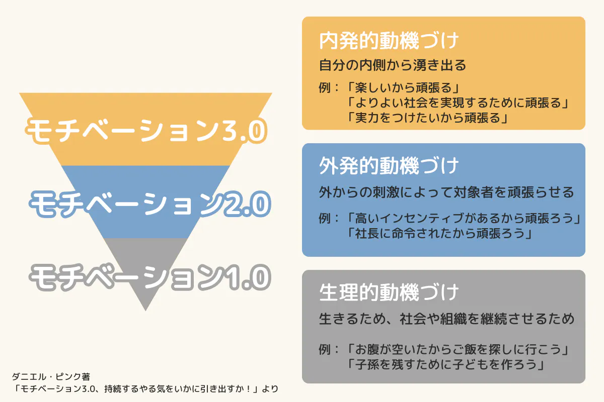 お腹がすいたからご飯を探すなど”生きるため”に必要な「生理的動機づけ(1.0)」や、労働生産性を高めるために”インセンティブなど外からの刺激”によって対象者を頑張らせようとする「外発的動機づけ(2.0)」だけでは不足し、単純作業ではないクリエイティブやイノベーションを生むための創造力の源泉として、内発的モチベーションによる自主的な行動や成長が重視されています。