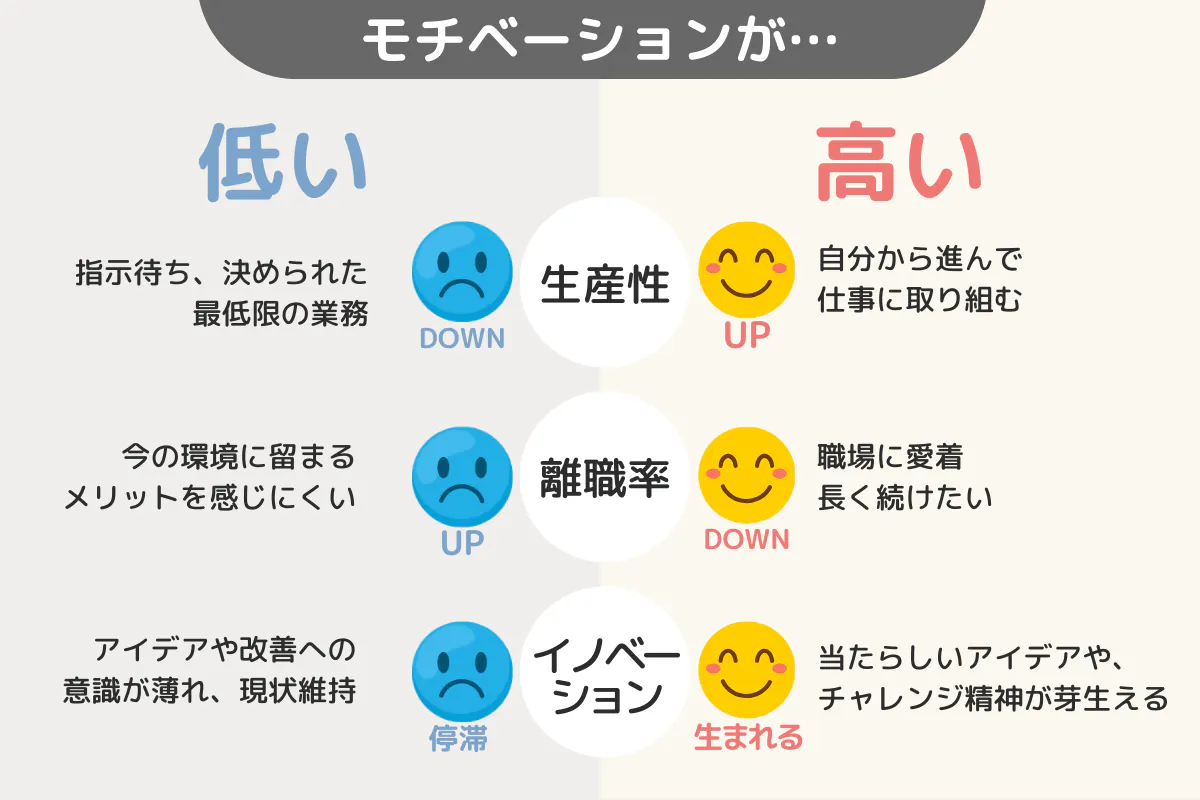 モチベーションが高いと、仕事に対する前向きな姿勢が生まれ、生産性が上がったり、チームの協力やアイデアが増えたり、働く環境もより明るくなります。逆にモチベーションが下がってしまうと、業務に対する意欲が薄れてしまい、仕事に取り組むエネルギーも低くなりやすいです。