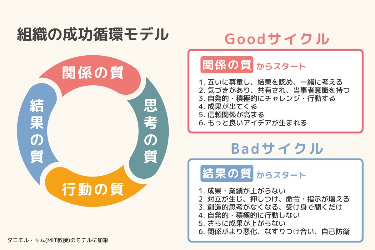 以下の図にも示した通り、成果・業績などの結果から求めるのではなく、まずは関係の質を高めることが、組織の好循環につながります。