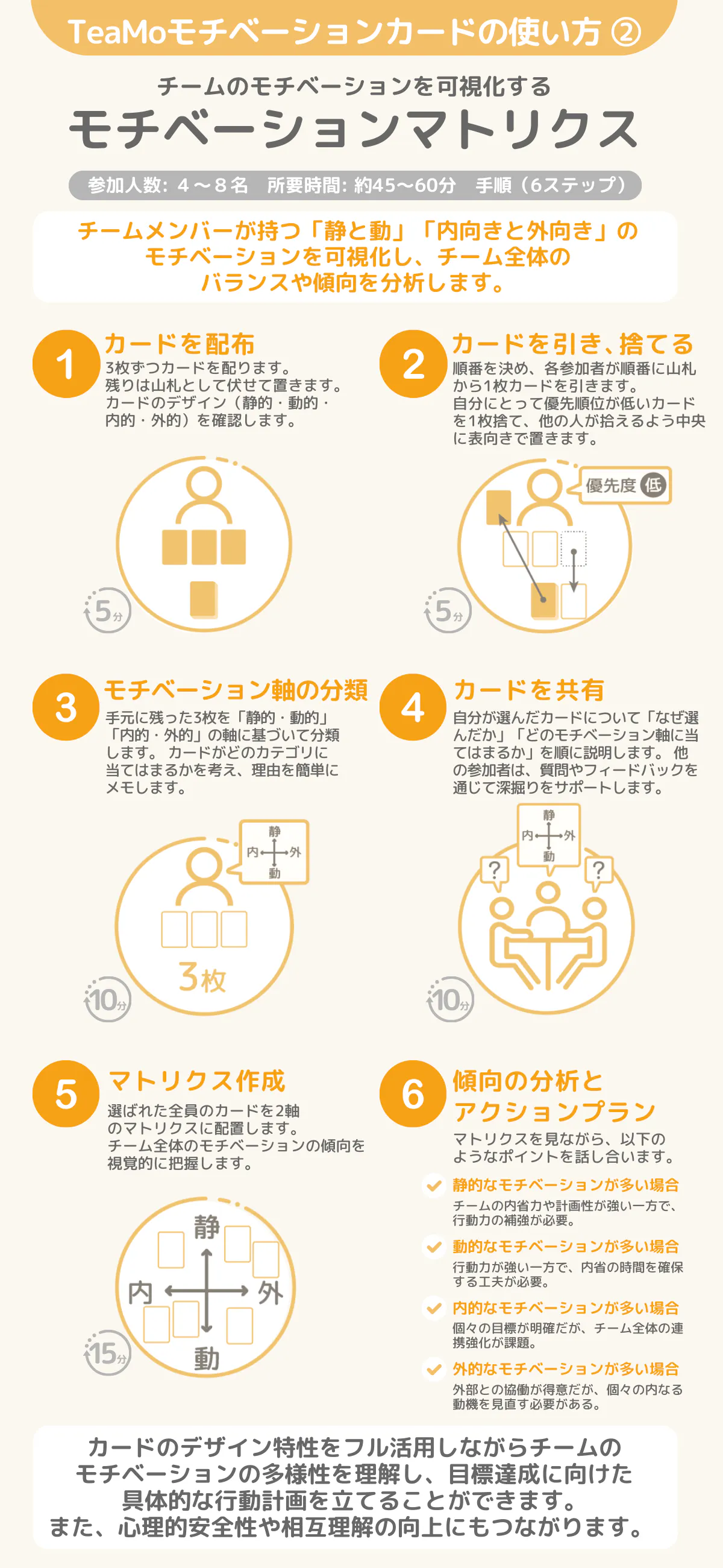 「TeaMoモチベーションカード」は、「内なる動機」と向き合いながらモチベーションの源を発見するためのツールです。自己理解を深めるだけでなく、チームや家族など他者との相互理解を促進し、心理的安全性を高めるディスカッションやワークショップに最適です。