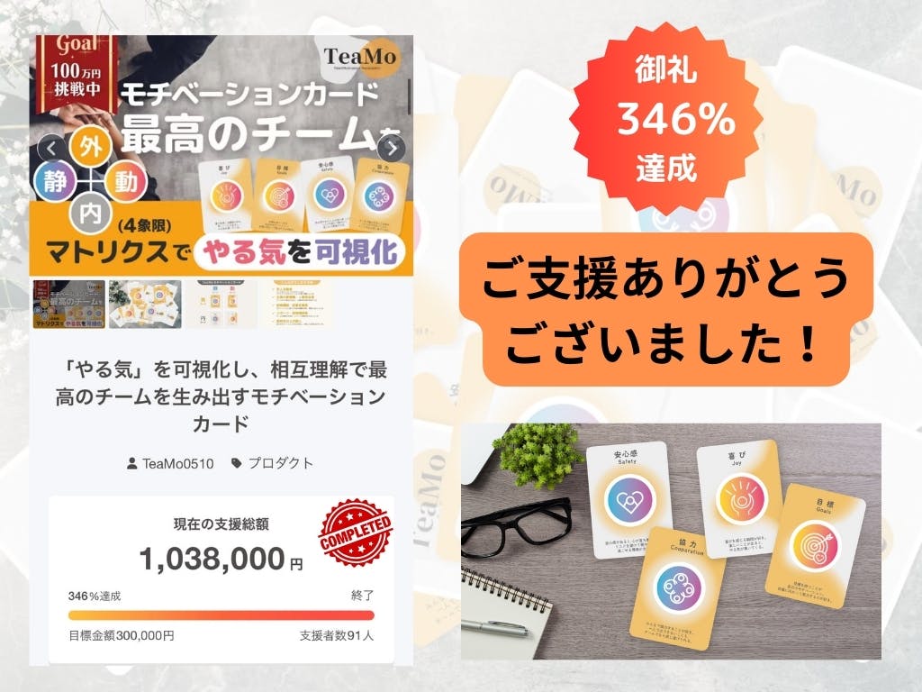 2025/03/05 16:00TeaMoモチベーションカードのクラウドファンディングにご支援・ご関心をお寄せいただいた皆さま、本当にありがとうございました。おかげさまで、目標達成、そしてネクストゴールまで到達することができました。スタート時は不安もありましたが、多くの方に応援していただき、このプロジェクトの価値を信じてくださったことが大きな力になりました。ご支援いただいた皆さまには、現在リターンの準備を進めており、順次お届けしてまいります。TeaMoモチベーションカードが、皆さま自身のモチベーションを見つめ直すきっかけになったり、周りの人との対話を深めるツールになったりすれば嬉しく思います。このプロジェクトはここで終わりではなく、モチベーションを大切にする文化を広げていく挑戦の始まりだと考えています。これからもTeaMoの活動を温かく見守っていただけると幸いです。改めまして、ご支援・応援いただいたすべての皆さまに、心より感謝申し上げます。本当にありがとうございました!感謝を込めて。一般社団法人 日本チームモチベーション協会共同代表 小倉嘉夫 もっと見る
