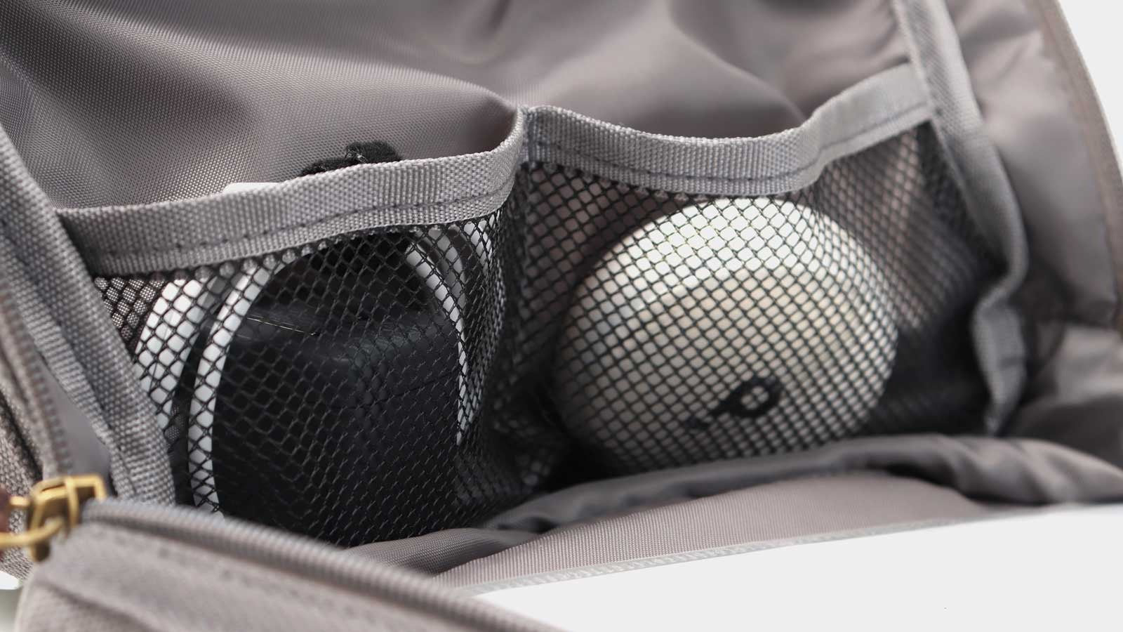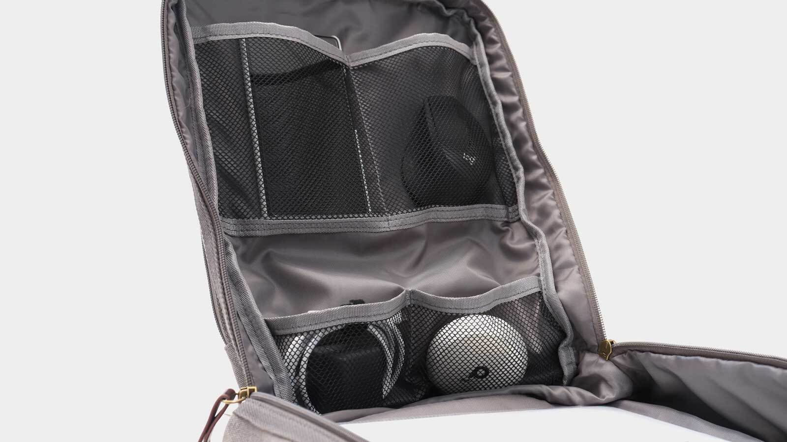 一目でわかるメッシュポケットをつけました。モバイルバッテリーやコード類、マウスなど小物のガジェットを4分割で分散収納できます。