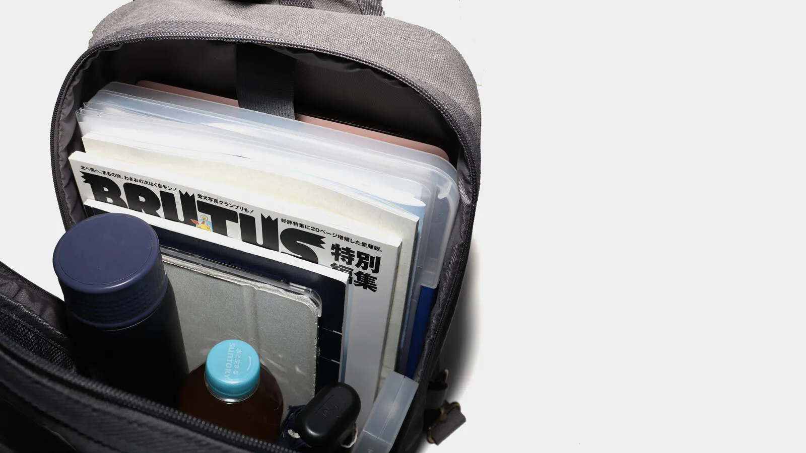 A4クリアファイルに加え、ペットボトルや折畳み傘などを入れても窮屈にはならない厚みがあります。