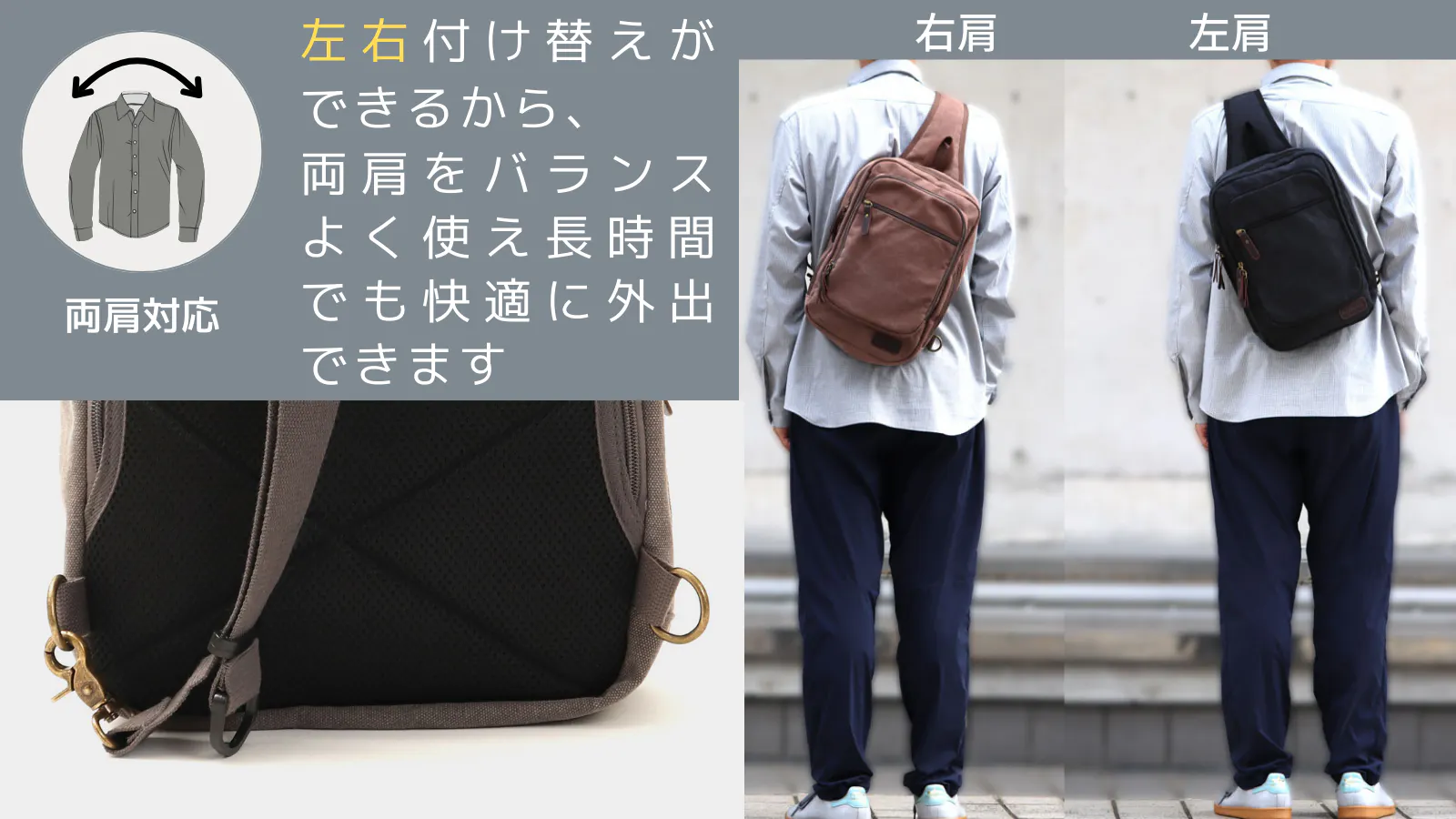 身体にフィットすることで揺れを防ぎ、安定して重さを軽減。肩の高い位置で背負うことで荷物が軽く感じられます。