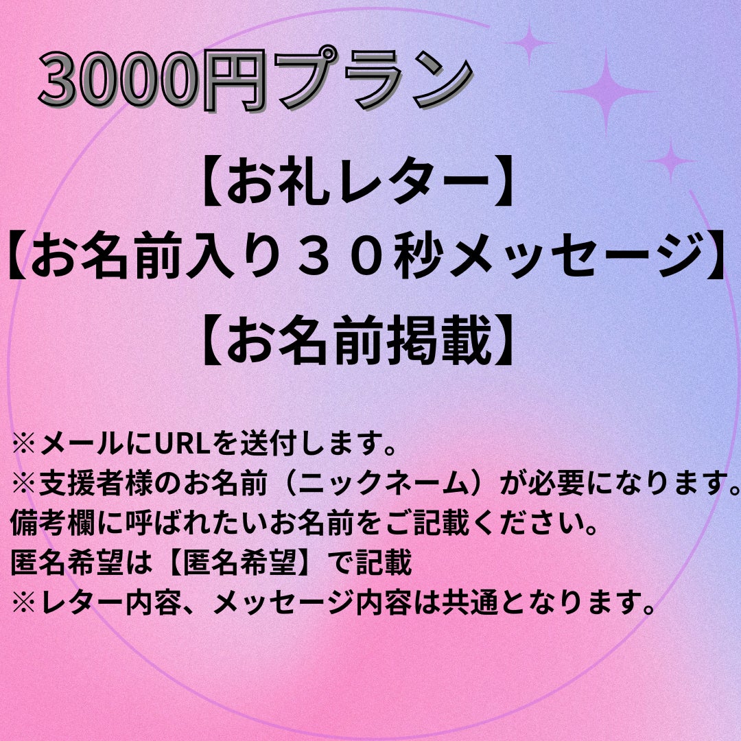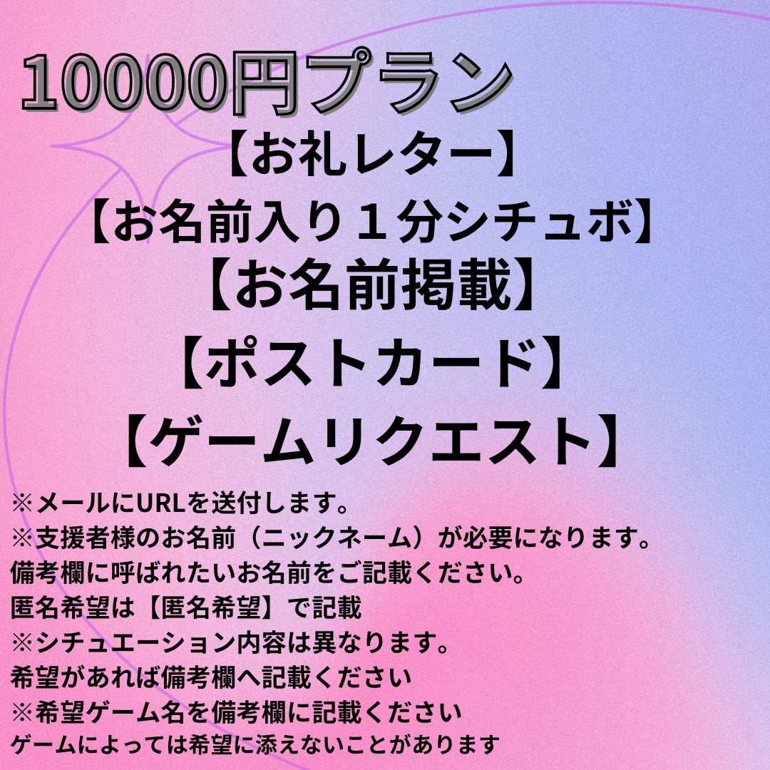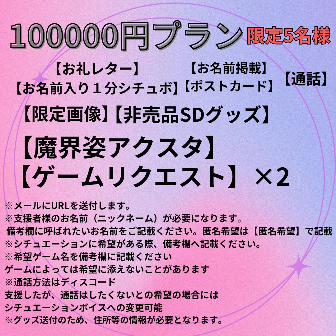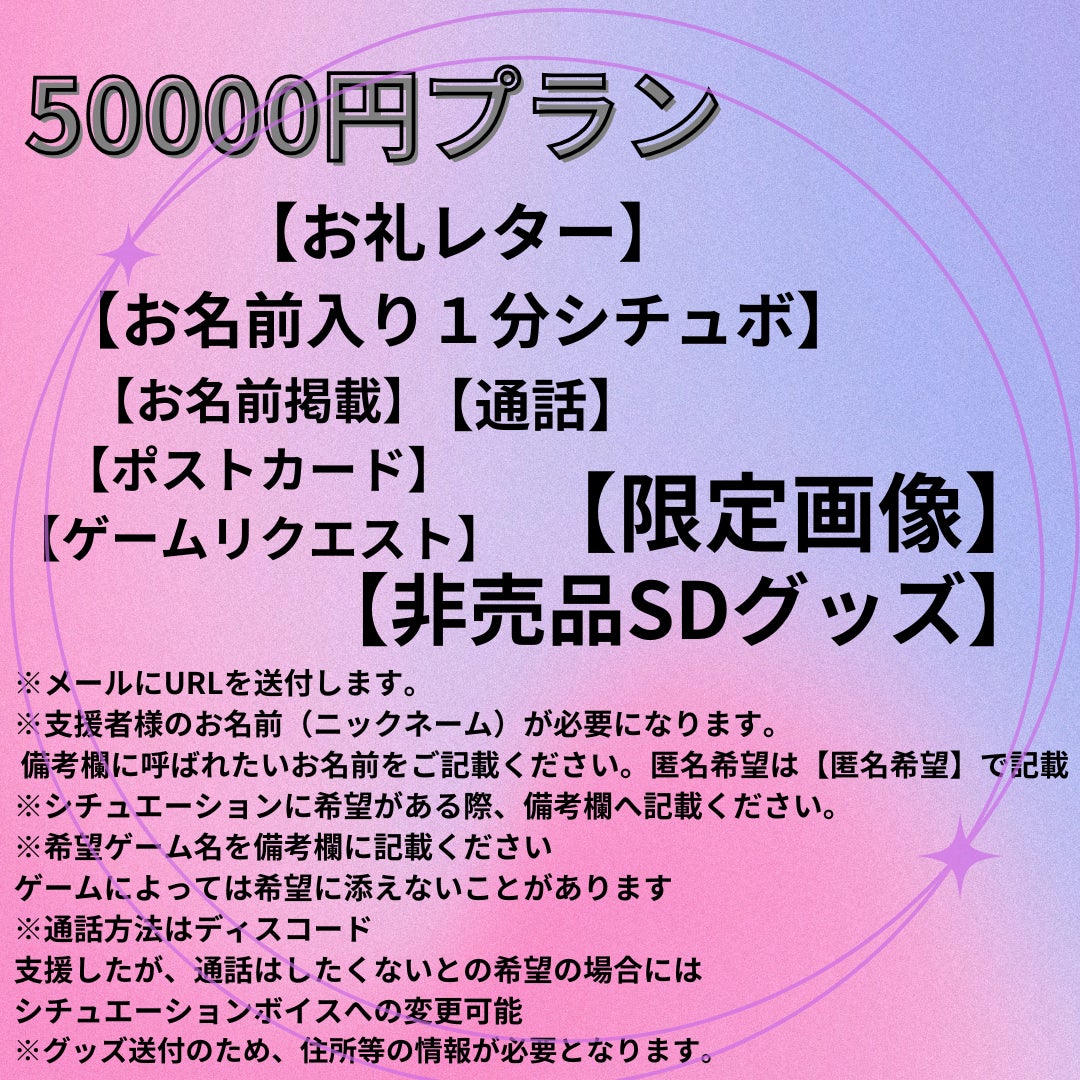 2025/05/04 13:42既に支援いただいている皆様はほんとにありがとうございます!4月の開始から1か月が経過しましたが、まだまだ達成目標までは道のりが遠いです(´;ω;`)リスナーさんからの希望(?)もあり、プランを追加させてもらいました。20万というさらに上の金額です!追加プランのリターンとしては、お願い券が追加されてます!個人で通話時間もっと欲しいとか、シチュエーションボイスが長いバージョンが欲しい、ゲームを一緒に行いたいなど内容は人によってそれぞれでOK!叶えられる範囲になりますが、できる限りお願いが叶えられるようにしますね☆ただ、無理はしすぎないで支援いただくようにだけお願いしますね・・・ちなみに、リターンで物が欲しくないとの意見もあったので、お名前掲載、レターのみの5000円プランも追加してます。*****条件について配信でしかお伝えしていないことがあったのでこちらでお知らせ******Q.複数支援をした場合にリターンは重複するのですか?A.グッズなどの物によるリターンは重複がありません×ただ、シチュエーションボイスについては重複するので支援いただいた分だけ複数シチュエーションボイスがお届けになります!残り26日と1か月を切りましたが、頑張りたいと思います!引き続き応援よろしくお願いします(^▽^)/ もっと見る
